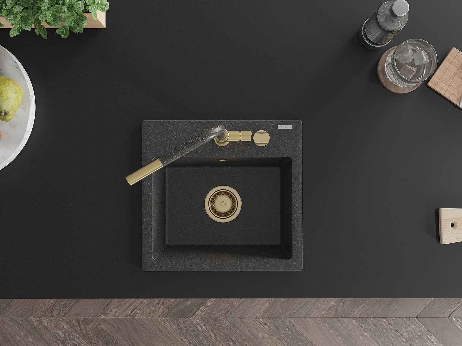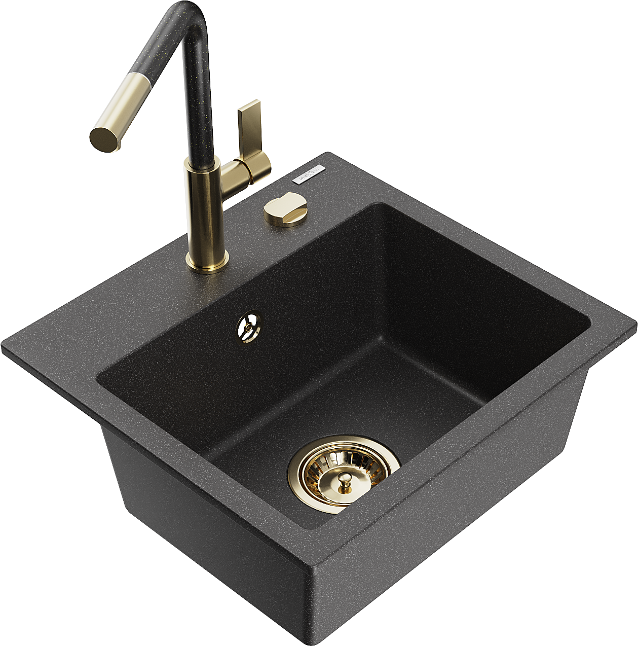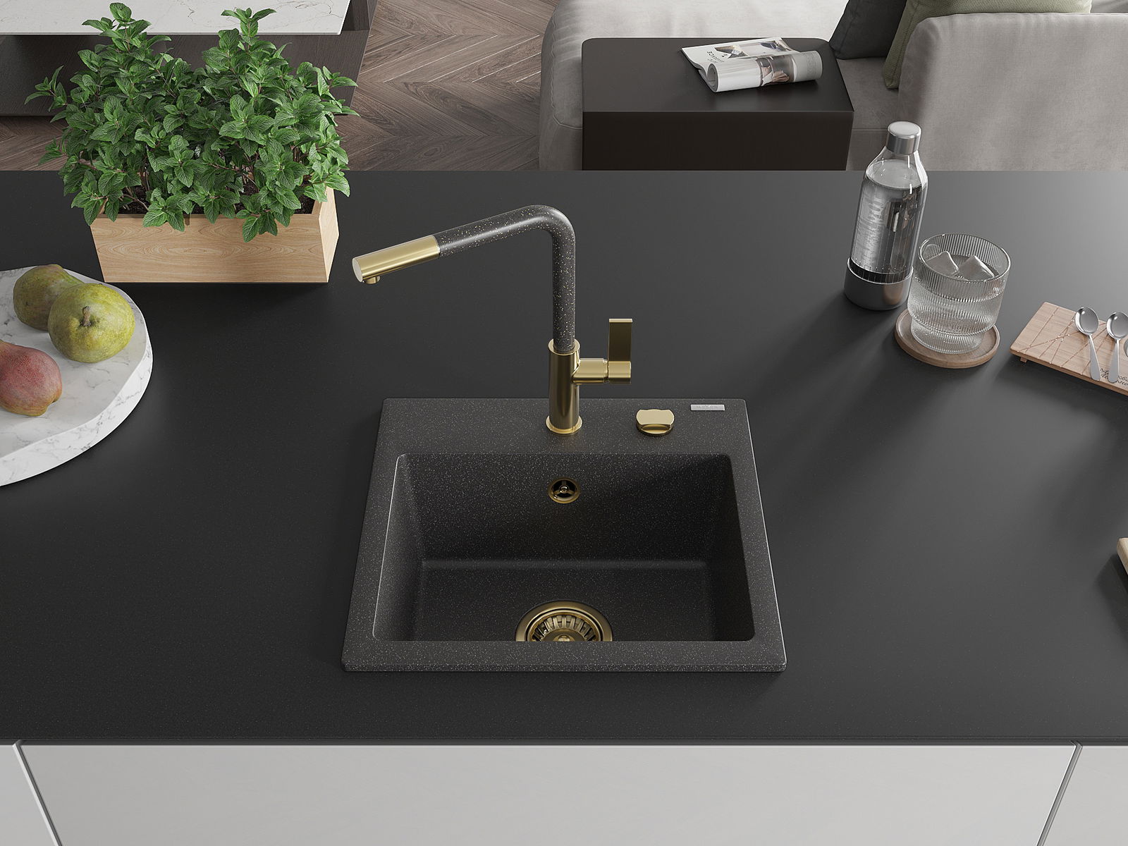 Mexen Milo гранитна мивка с 1 отделение с кухненски смесител Flora, черен на петна - 6505-76-670401-75-G