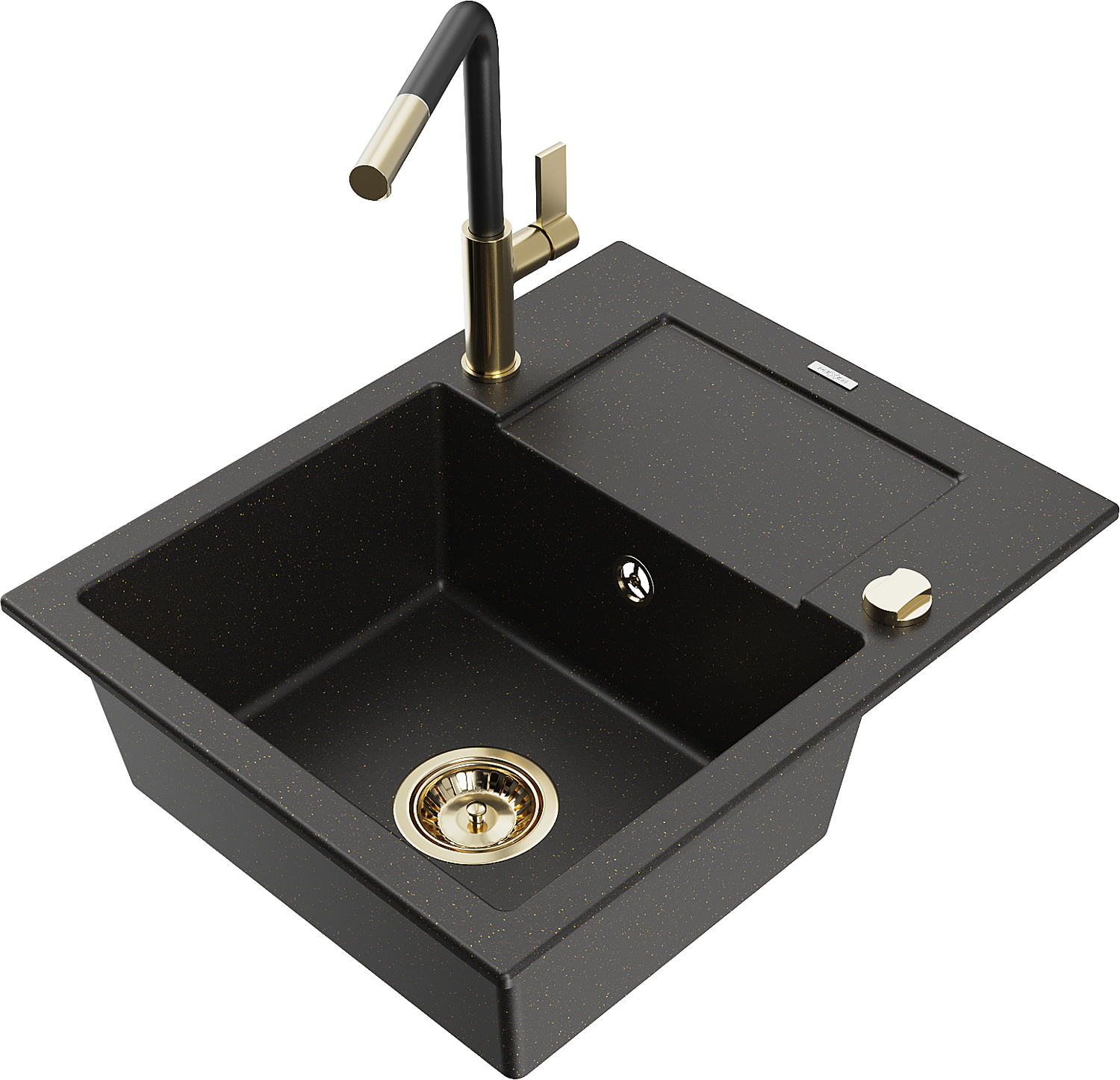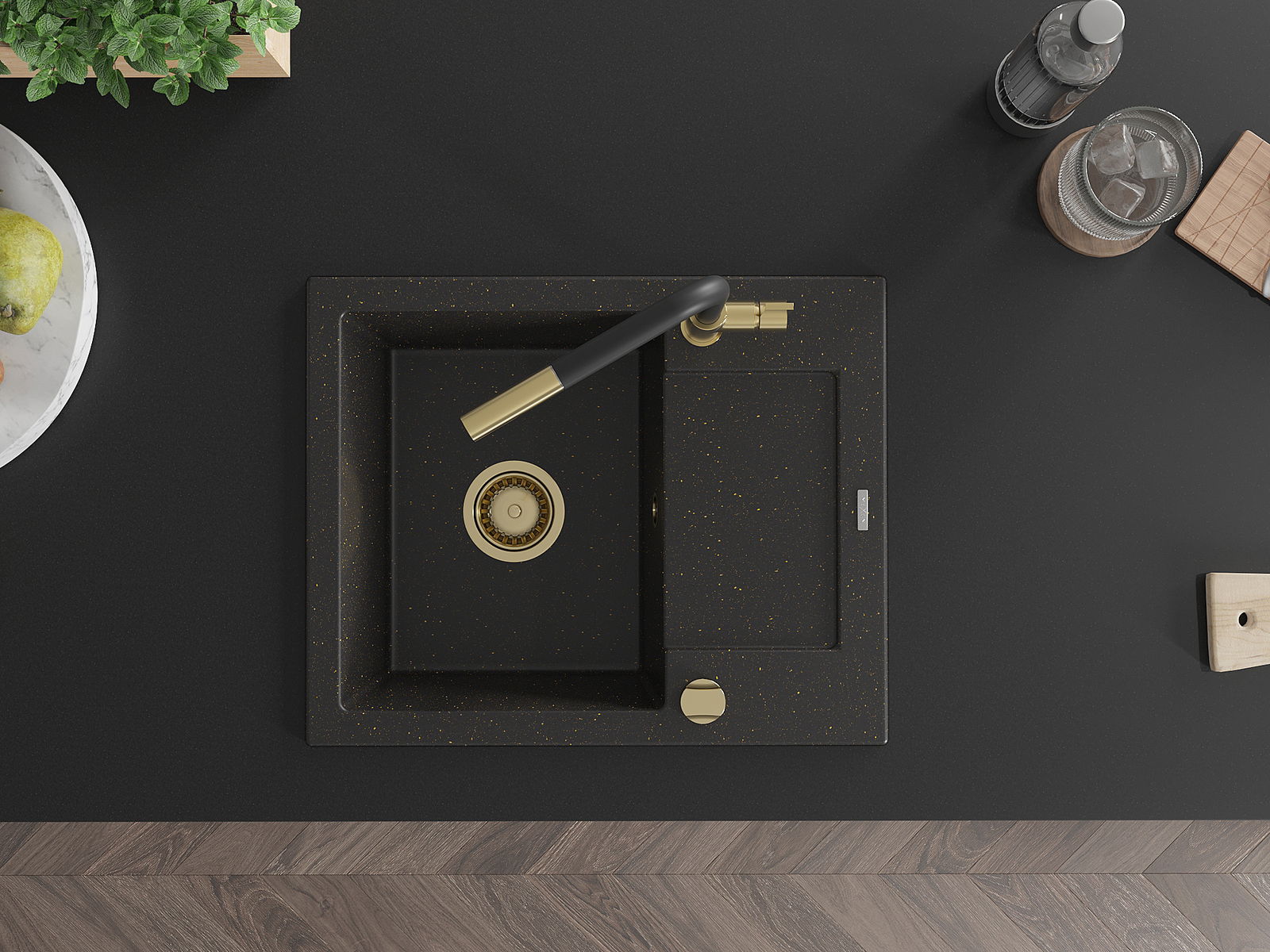 Mexen Enzo гранитна мивка с 1 отделение с отцедник и кухненски смесител Flora, черен/златист металик - 6506-75-670401-57-G