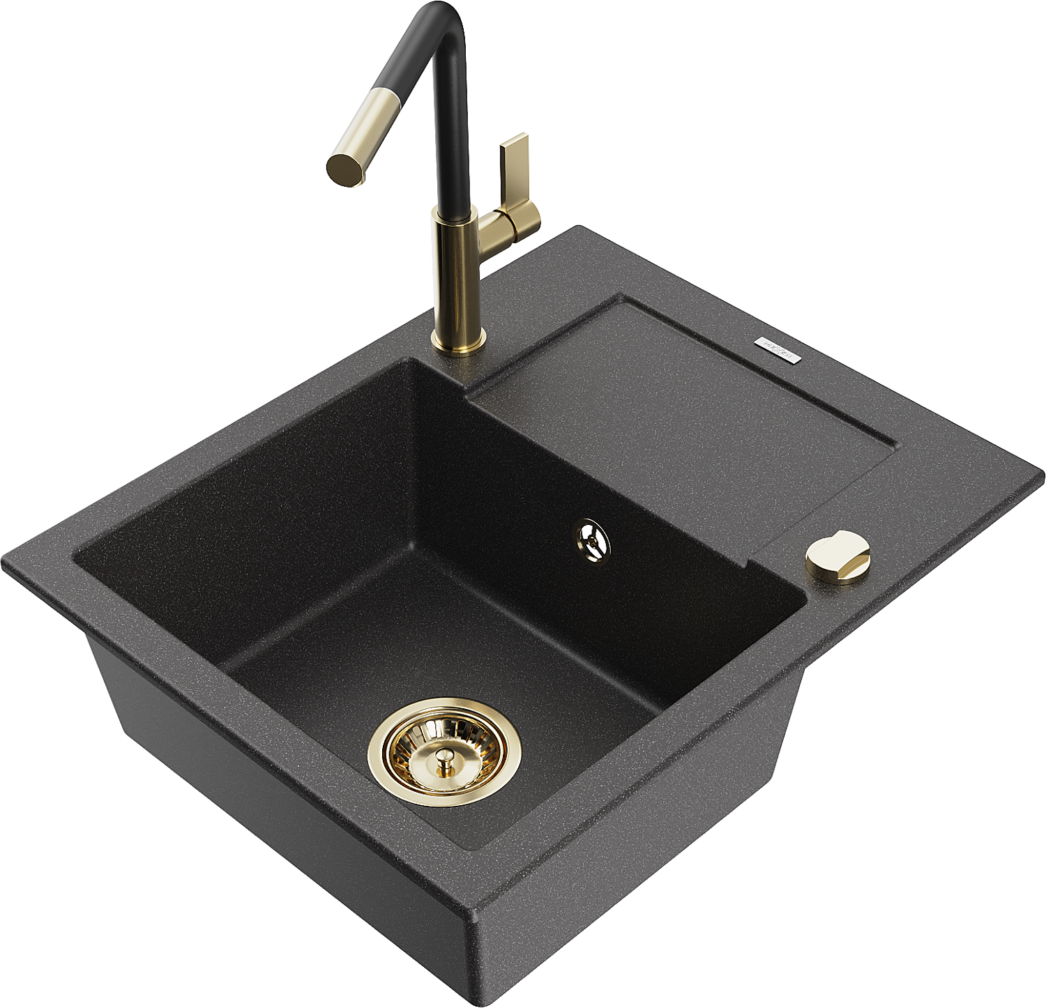 Mexen Enzo кухненска мивка от гранит с 1 корито с отцедник и кухненски смесител Flora, черен напръскан - 6506-76-670401-57-G
