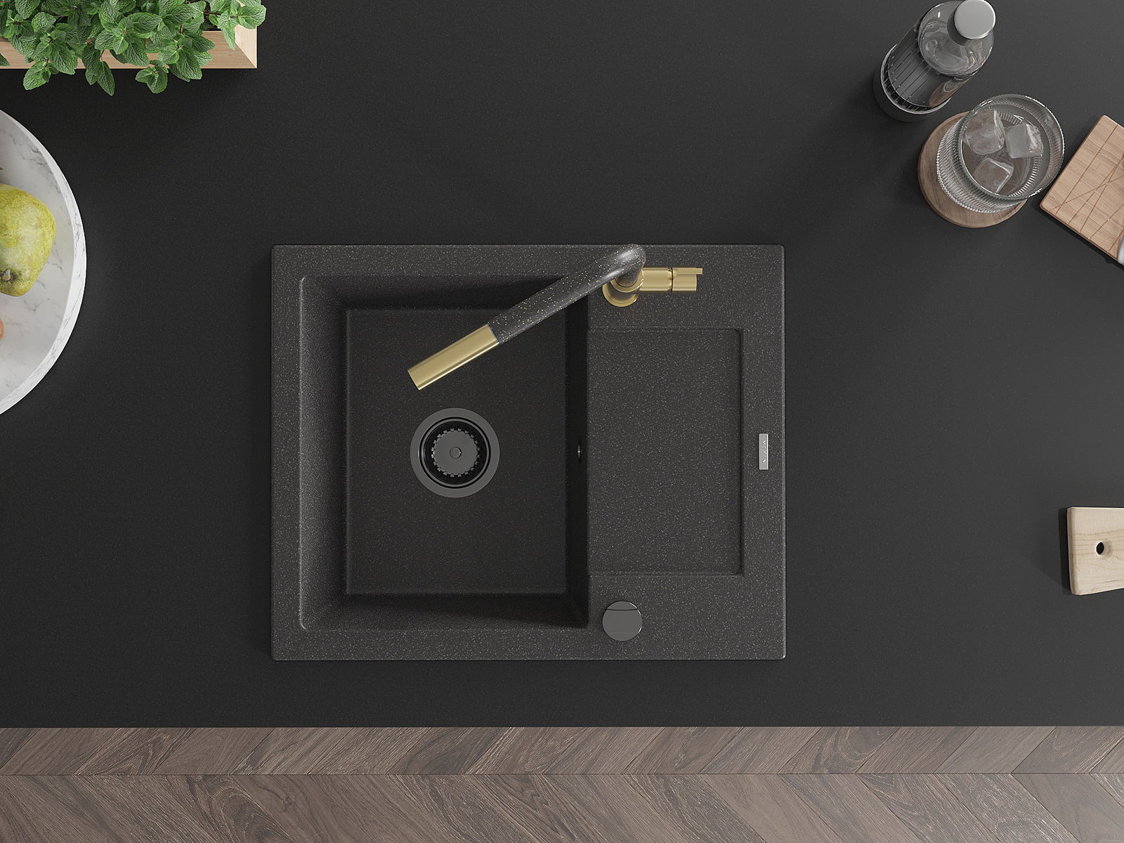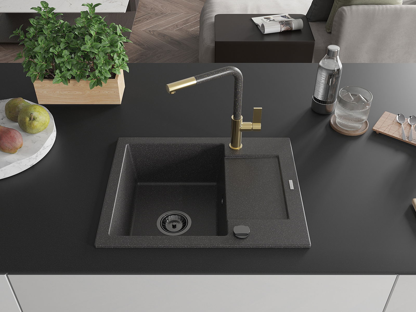 Mexen Enzo кухненска мивка от гранит с 1 отделение и отцедник и кухненски смесител Flora, черен с пръски - 6506-76-670401-75-B