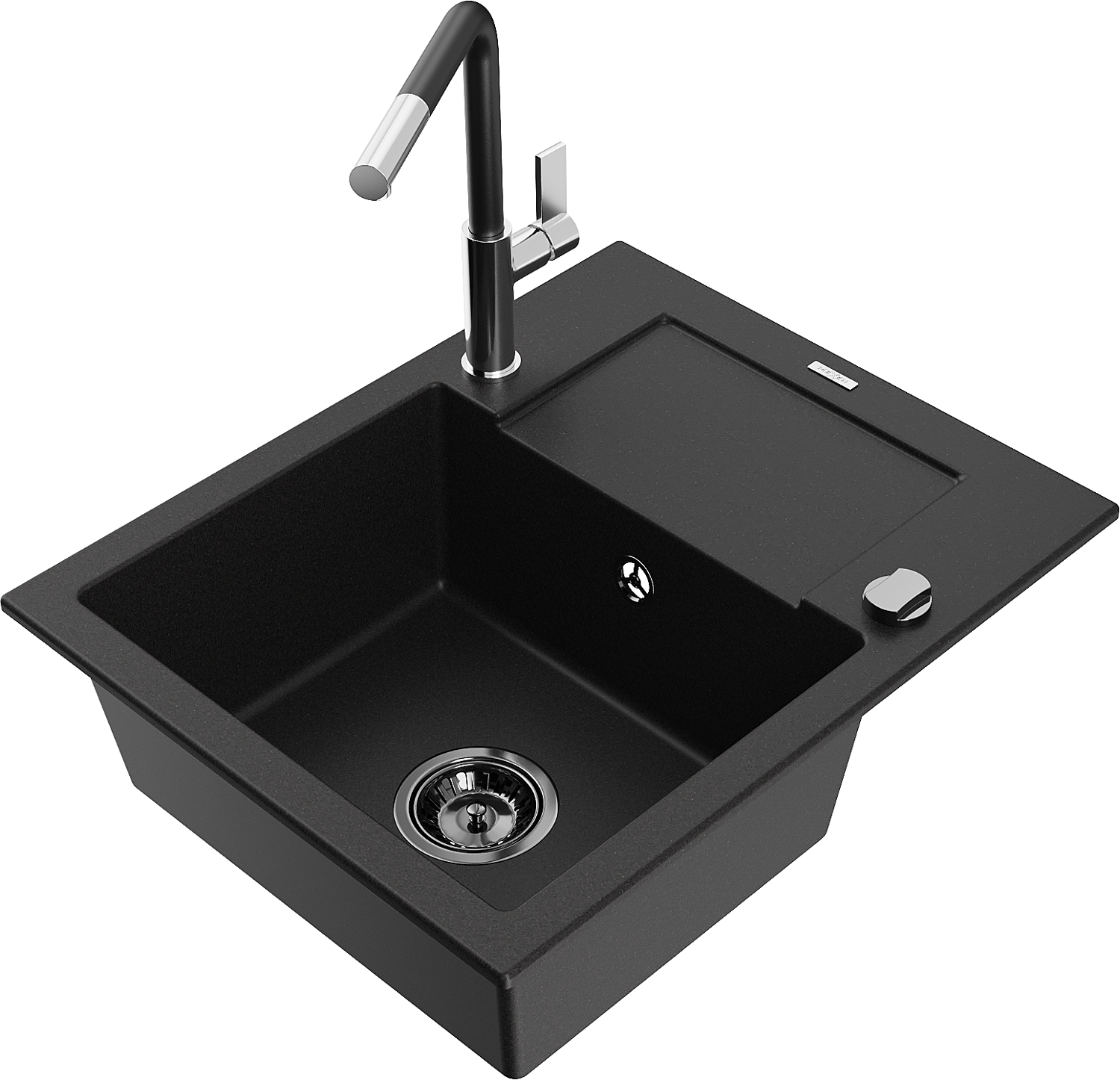 Mexen Enzo гранитна мивка с 1 отделение с дренаж и кухненски смесител Flora, черен - 6506-77-670401-07-B