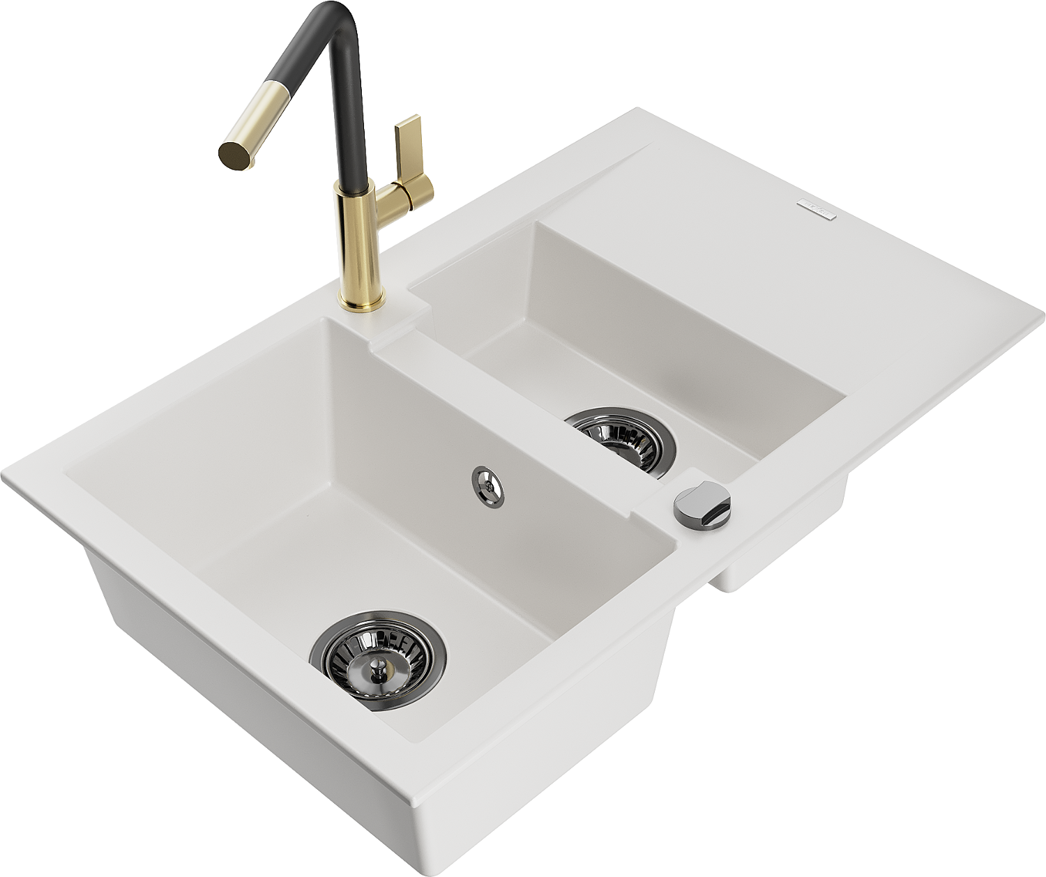 Mexen Gaspar гранитна кухненска мивка 1,5 камери с дренаж и кухненски смесител Flora, бял - 6507-20-670401-57-B