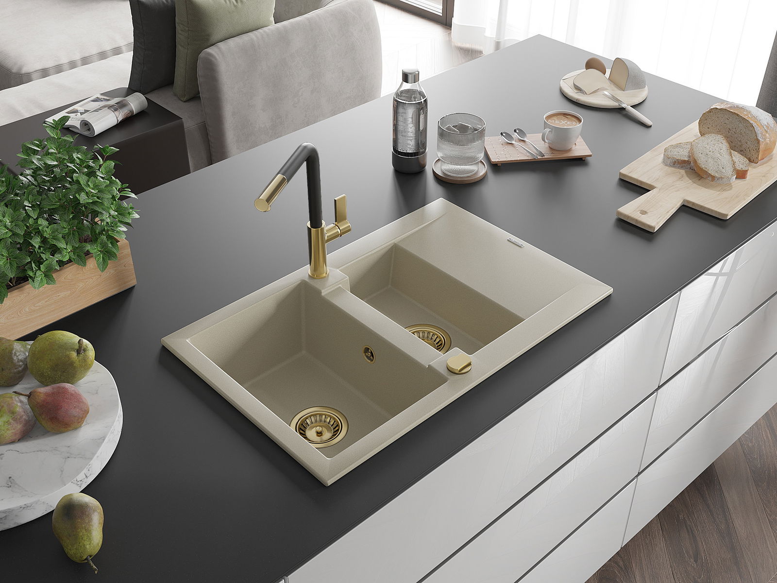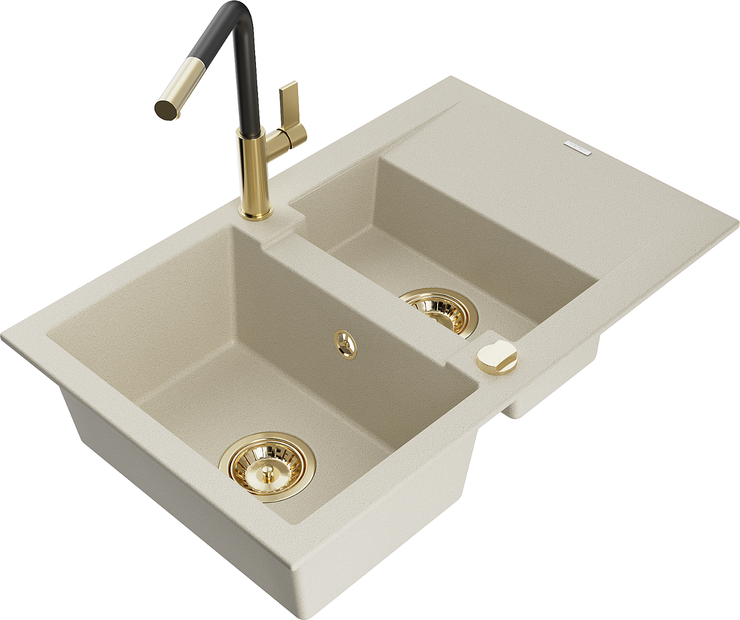 Mexen Gaspar гранитна мивка 1,5-коморна с отцедник и кухненски смесител Flora, бежова - 6507-69-670401-57-G