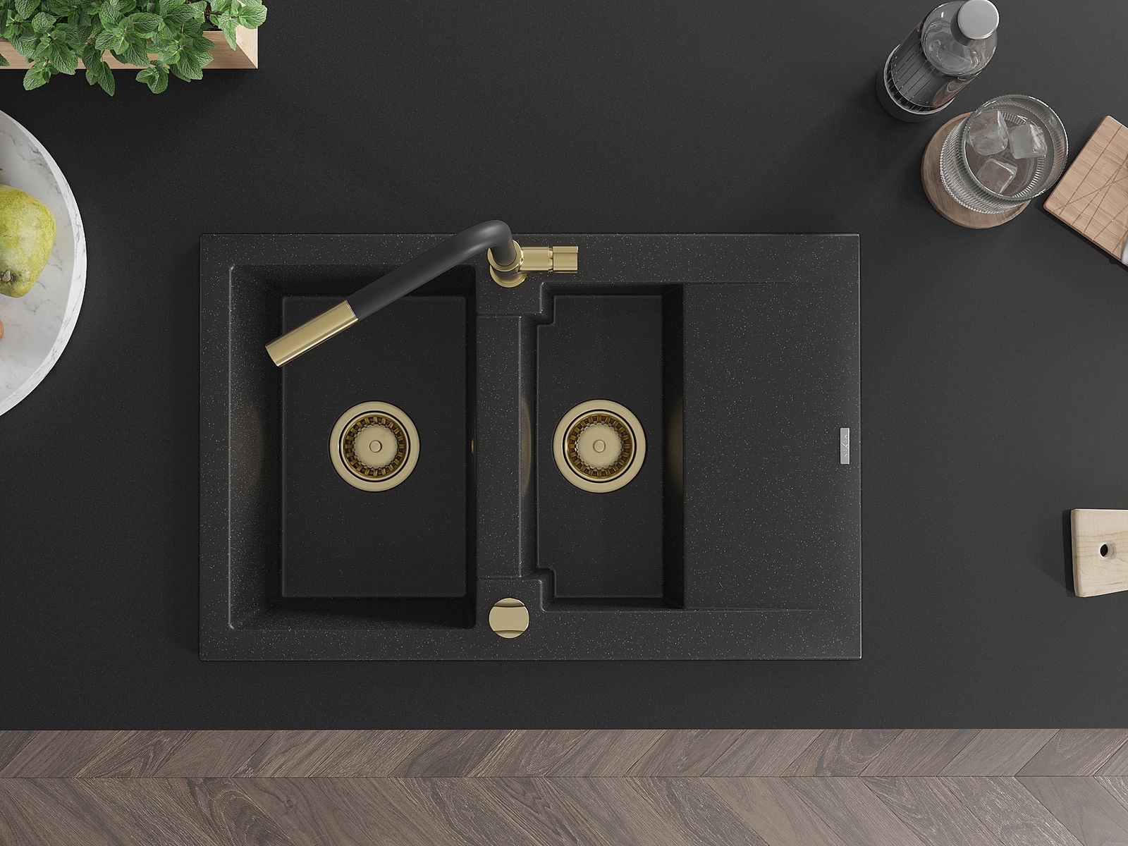 Mexen Gaspar гранитна мивка 1,5-коморна с отцедник и кухненски смесител Flora, черен/сребърен - 6507-73-670401-57-G