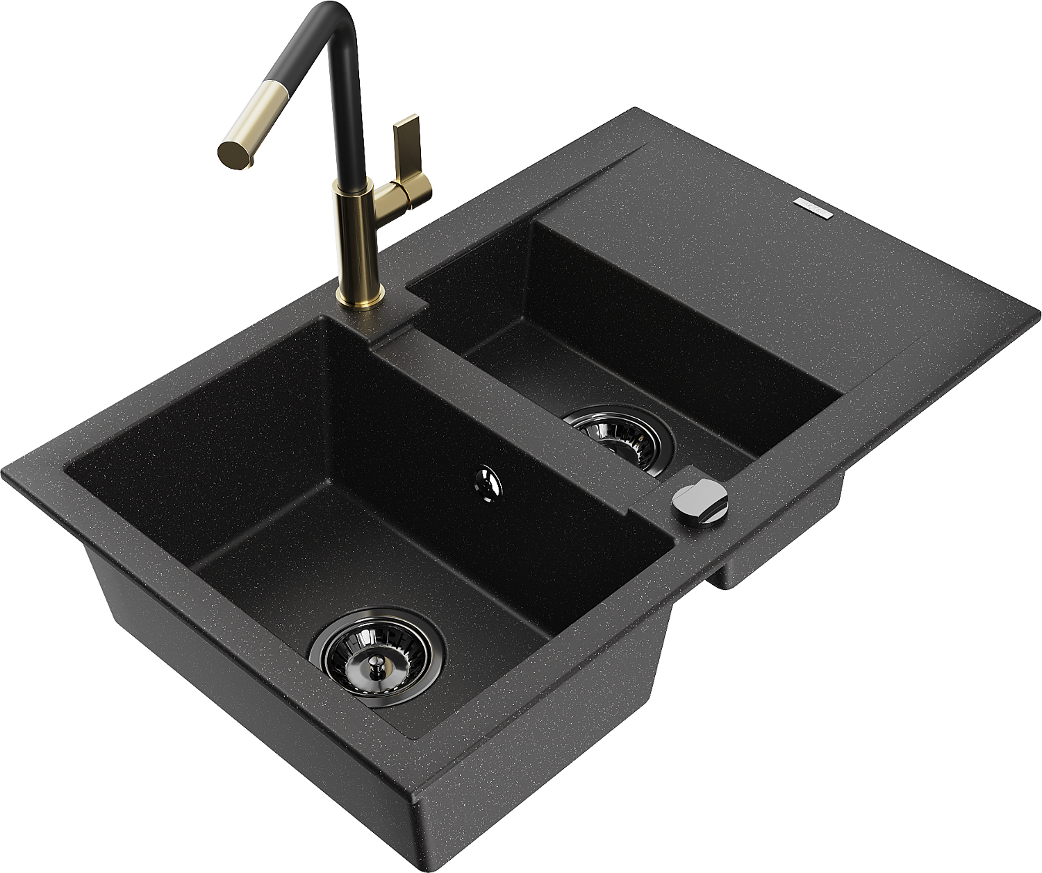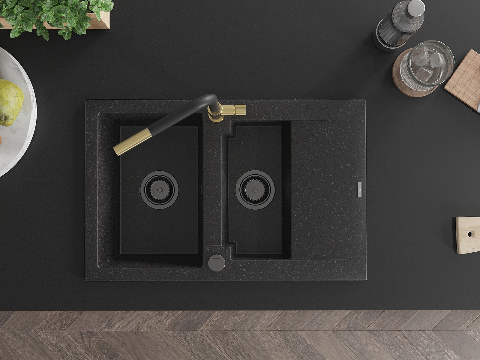 Mexen Gaspar гранитна мивка с 1,5 камери с отцедник и кухня смесител Flora, черно/сребърно - 6507-73-670401-57-B