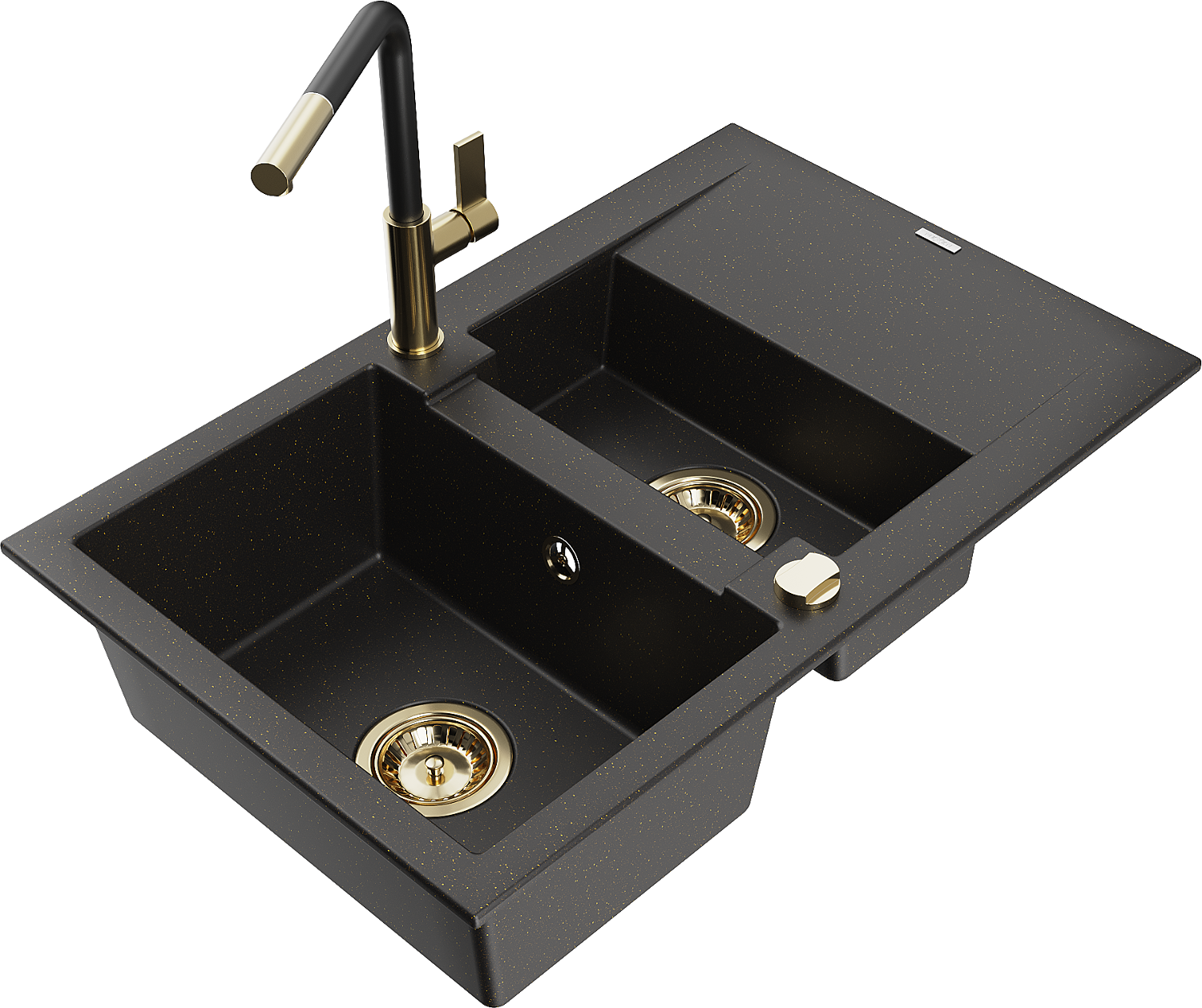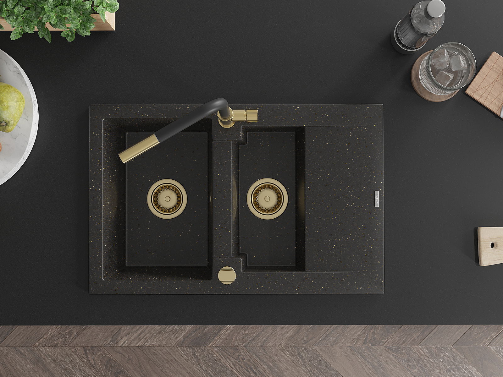 Mexen Gaspar гранитна мивка, 1,5 камери с отцедник и кухненски смесител Flora, черен/златист - 6507-75-670401-57-G