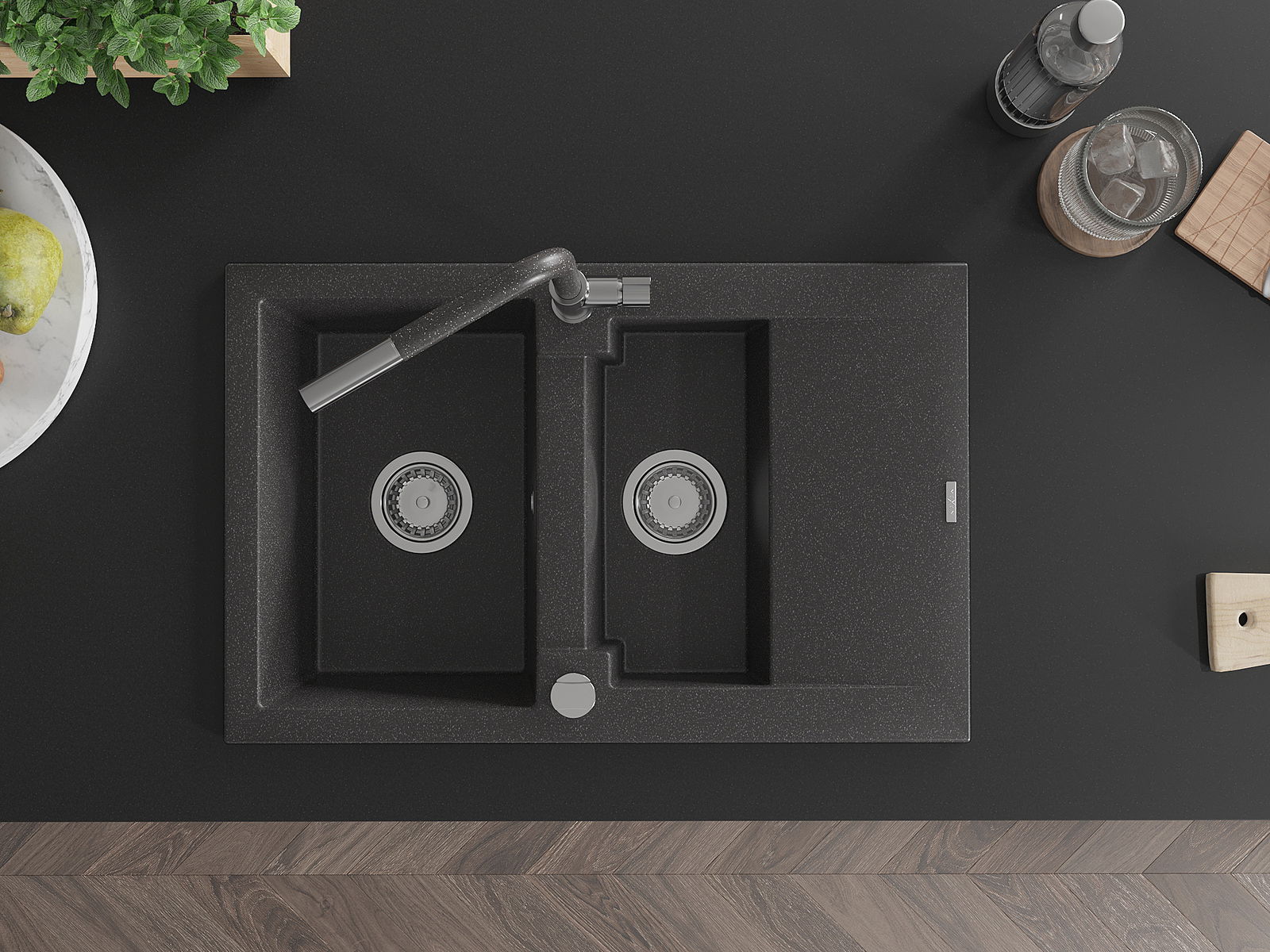Mexen Gaspar гранитна мивка 1,5 камери с отцедник и кухненски смесител Flora, черен на пръски - 6507-76-670401-08