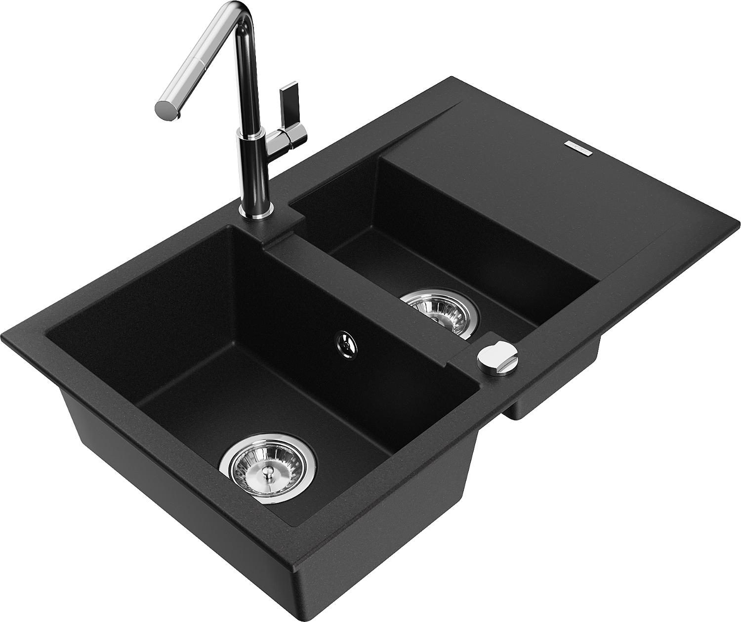 Mexen Gaspar гранитна кухненска мивка 1,5-коморна с отцедник и кухненски смесител Flora, черен - 6507-77-670401-00