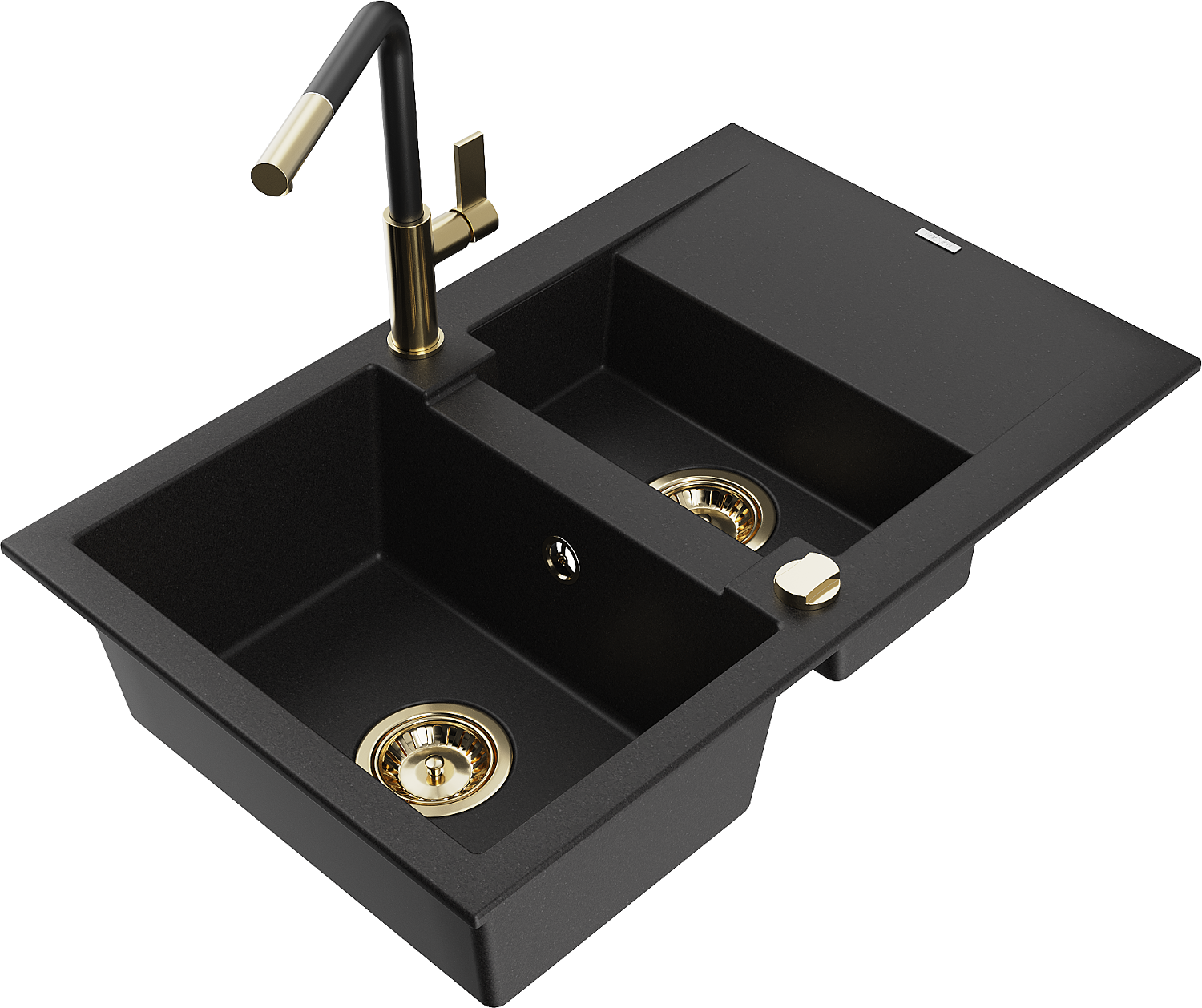 Mexen Gaspar гранитна мивка с 1,5 камери с отцедник и кухненски смесител Flora, черен - 6507-77-670401-57-G