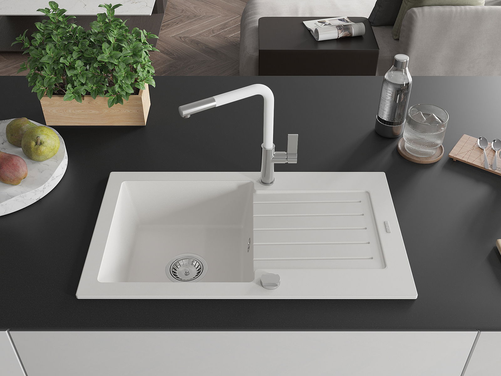Мивката е направена от висококачествен гранит. Това е елегантно и най -вече практично допълнение към всяка кухня, независимо от нейния стил. Висококачествената и гранитна издръжливост осигуряват много години употреба.