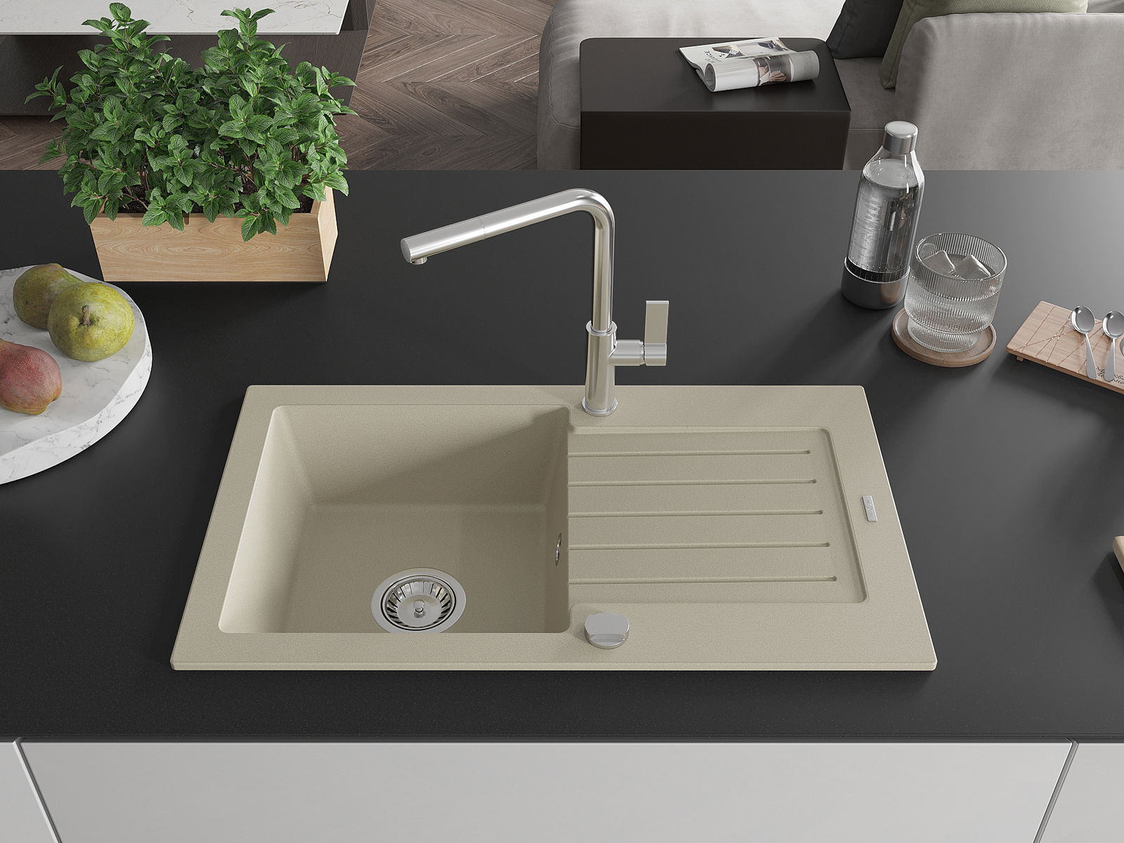 Mexen Pablo гранитна кухненска мивка с една камера и отцедник и кухненски смесител Flora, бежов - 6510-69-670401-00