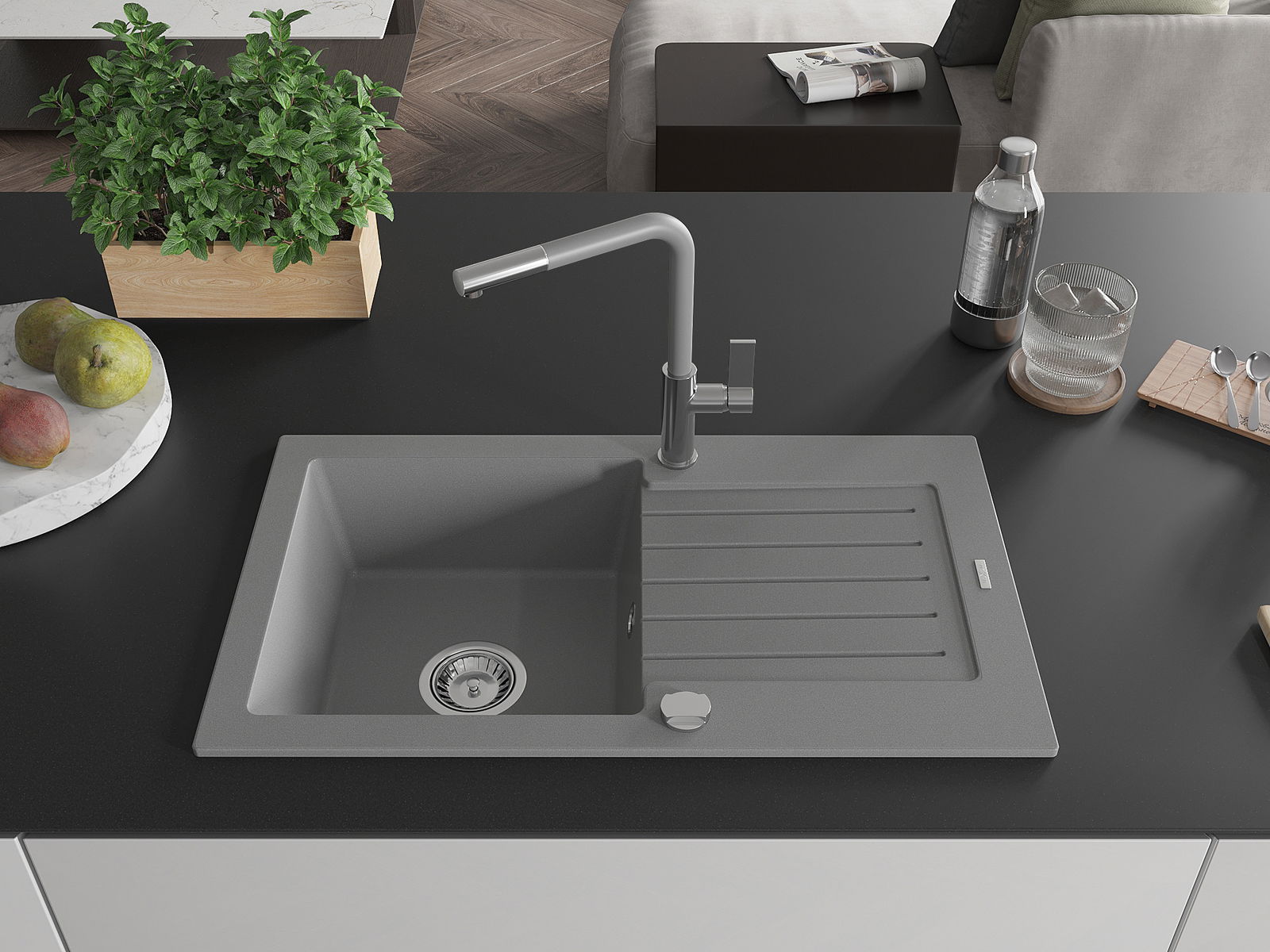 Мивката е направена от висококачествен гранит. Това е елегантно и най -вече практично допълнение към всяка кухня, независимо от нейния стил. Висококачествената и гранитна издръжливост осигуряват много години употреба.