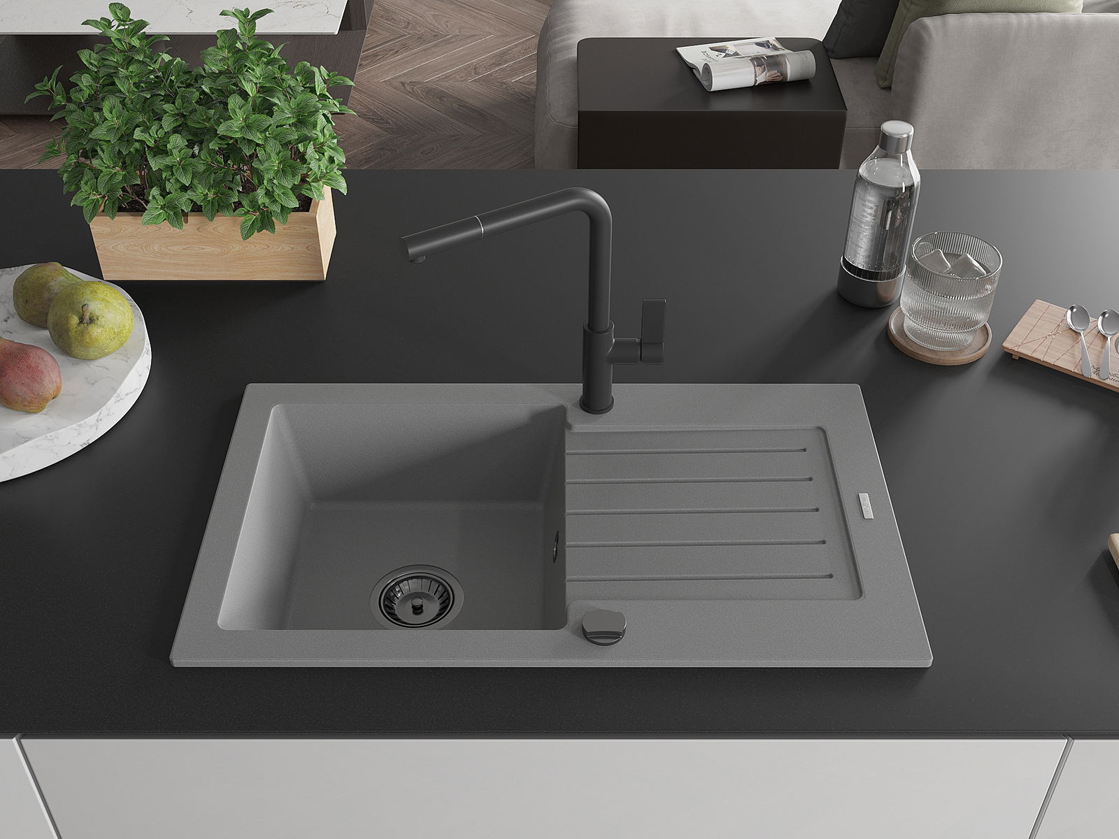 Mexen Pablo гранитна мивка с една камера с отцедник и кухненски смесител Flora, сив - 6510-71-670401-70-B