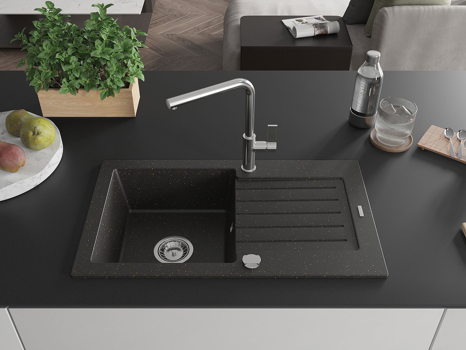 Мивката е направена от висококачествен гранит. Това е елегантно и най -вече практично допълнение към всяка кухня, независимо от нейния стил. Висококачествената и гранитна издръжливост осигуряват много години употреба.
