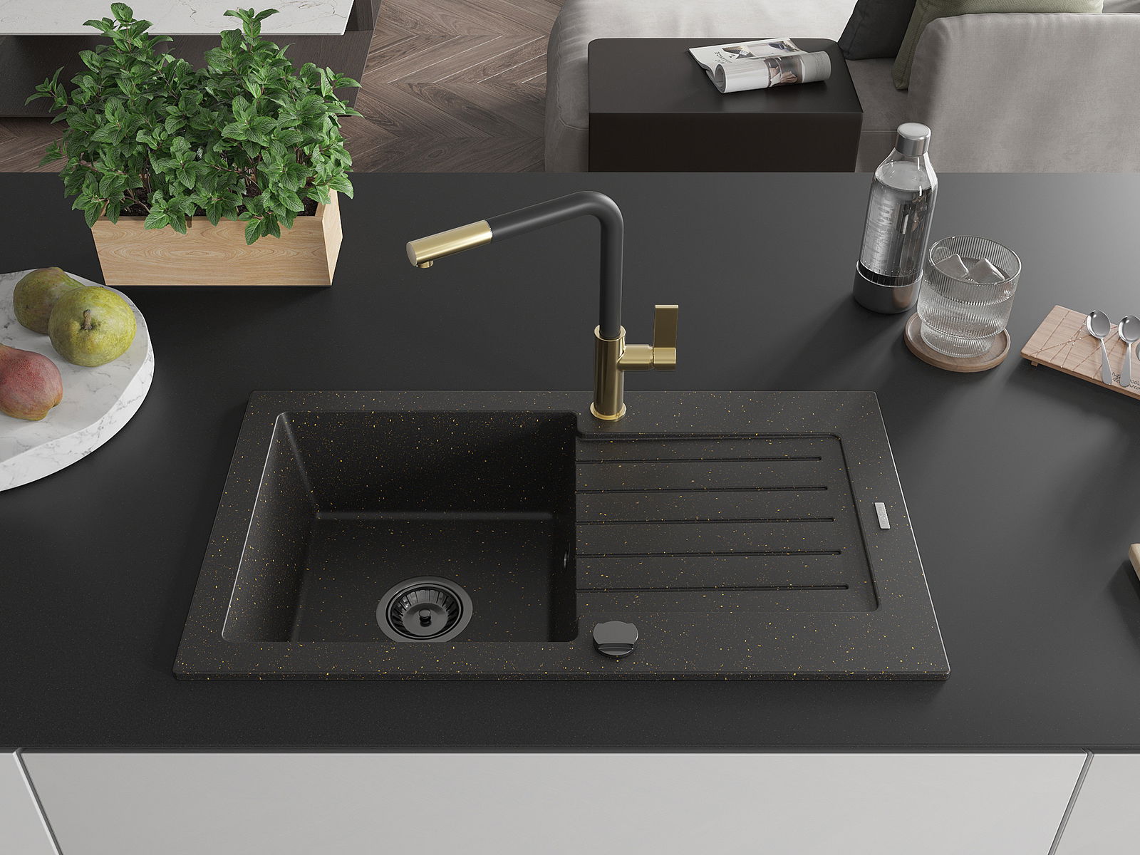 Мивката е направена от висококачествен гранит. Това е елегантно и най -вече практично допълнение към всяка кухня, независимо от нейния стил. Висококачествената и гранитна издръжливост осигуряват много години употреба.