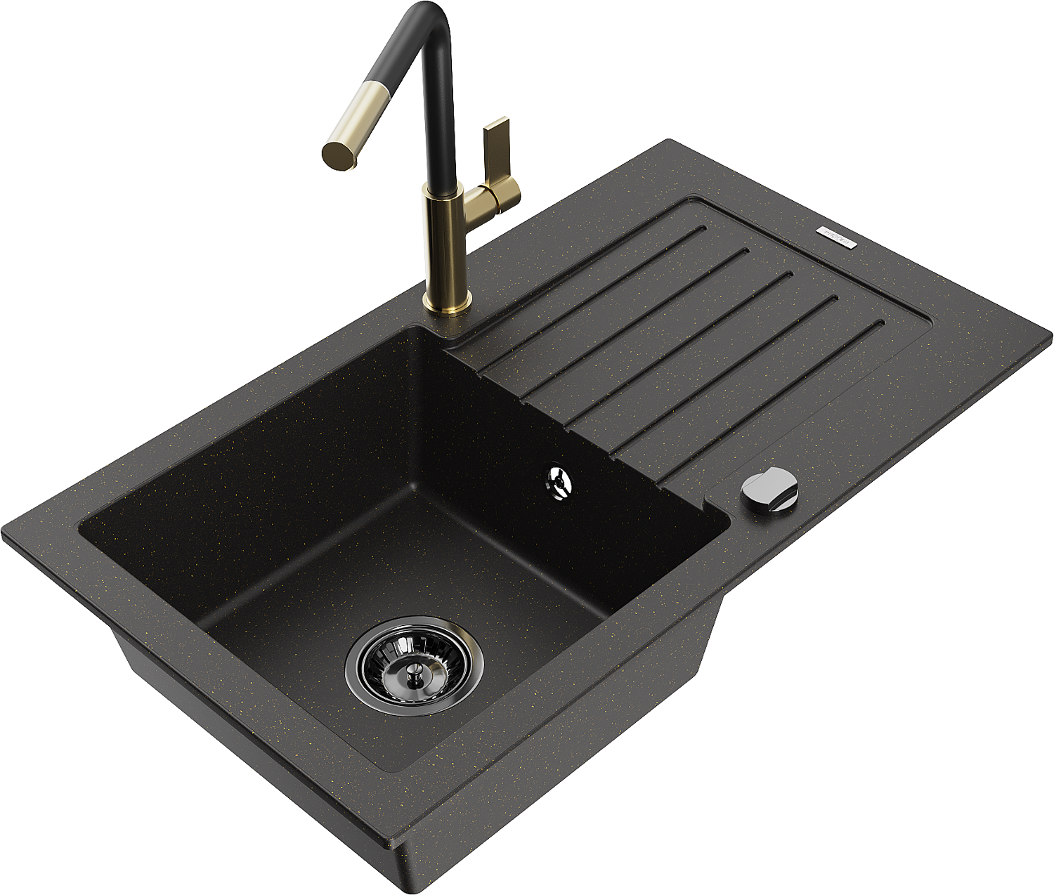 Mexen Pablo гранитна мивка с 1 отделение с отцеждач и кухненски смесител Flora, черно/златист металик - 6510-75-670401-57-B
