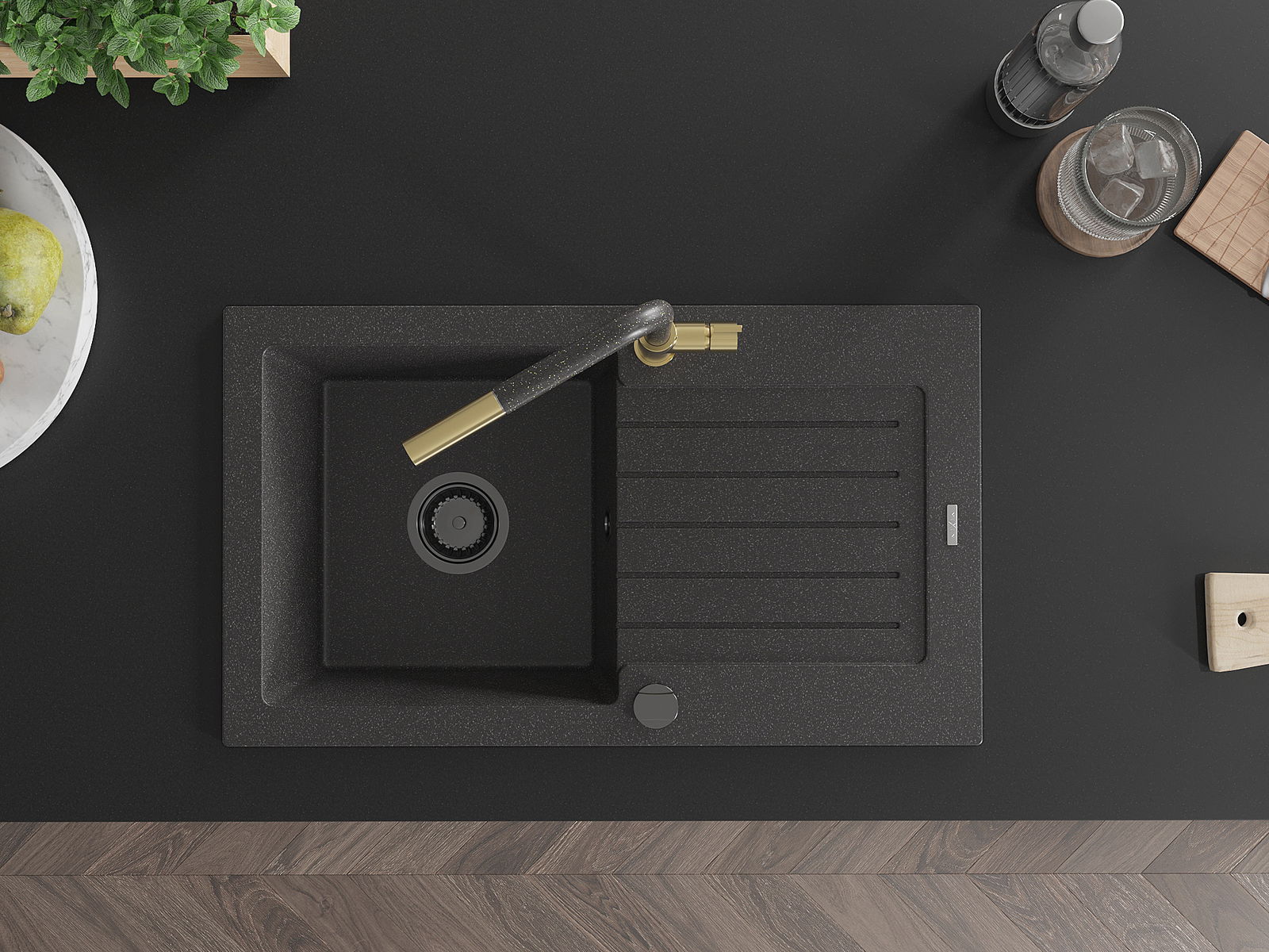 Mexen Pablo гранитна мивка, 1-коморна с отцедник и кухненски смесител Flora, черна напукана - 6510-76-670401-75-B