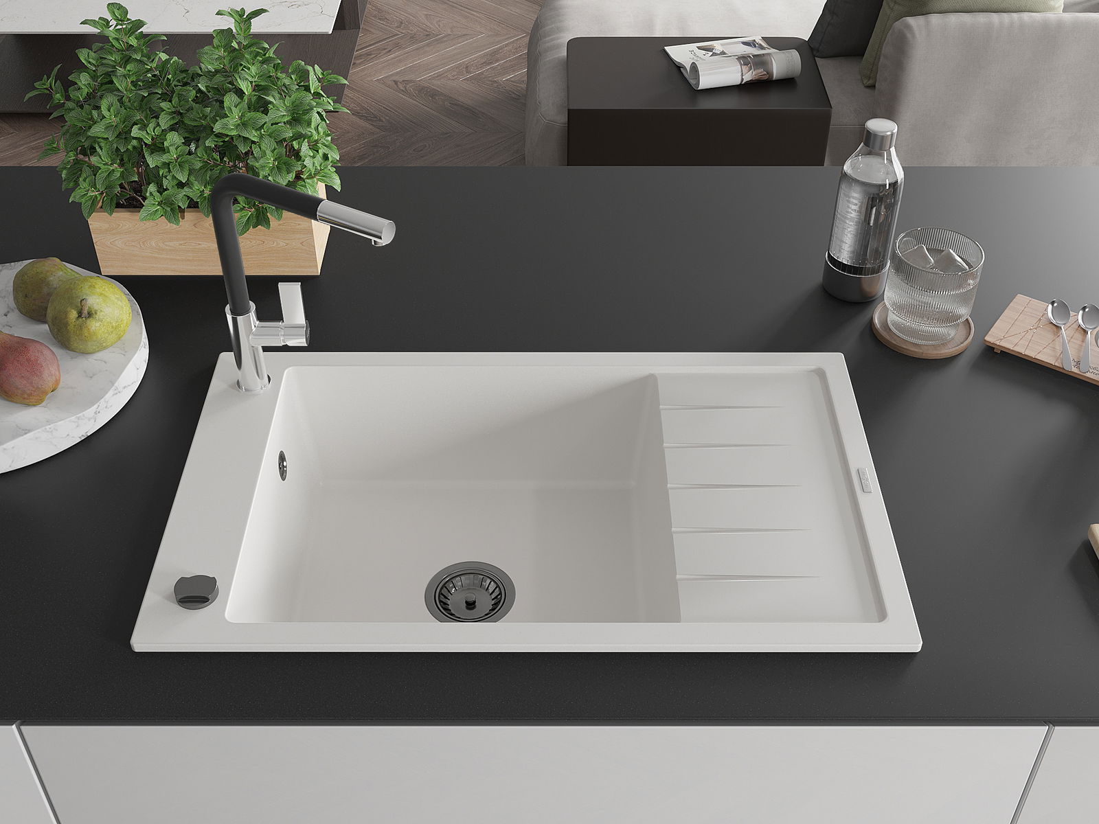 Мивката е направена от висококачествен гранит. Това е елегантно и най -вече практично допълнение към всяка кухня, независимо от нейния стил. Висококачествената и гранитна издръжливост осигуряват много години употреба.