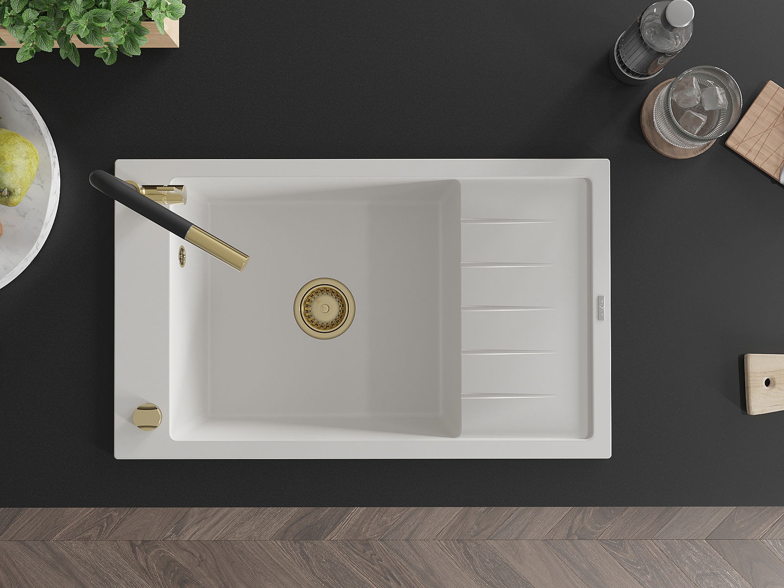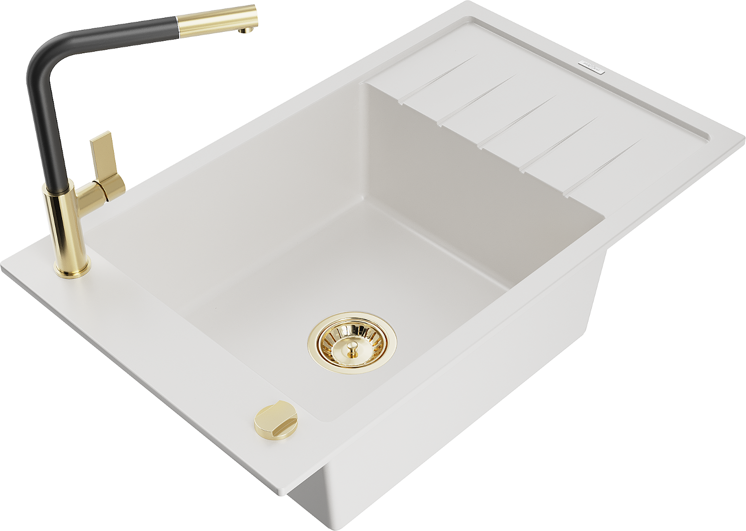 Mexen Elias гранитна мивка с 1 отделение с отцедник и кухненски смесител Flora, бял - 6511-20-670401-57-G