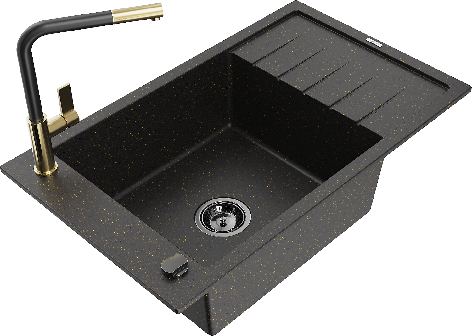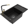 Mexen Elias гранитна мивка с 1 отделение с капковка и кухненски смесител Flora, черен/златист металик - 6511-75-670401-57-B