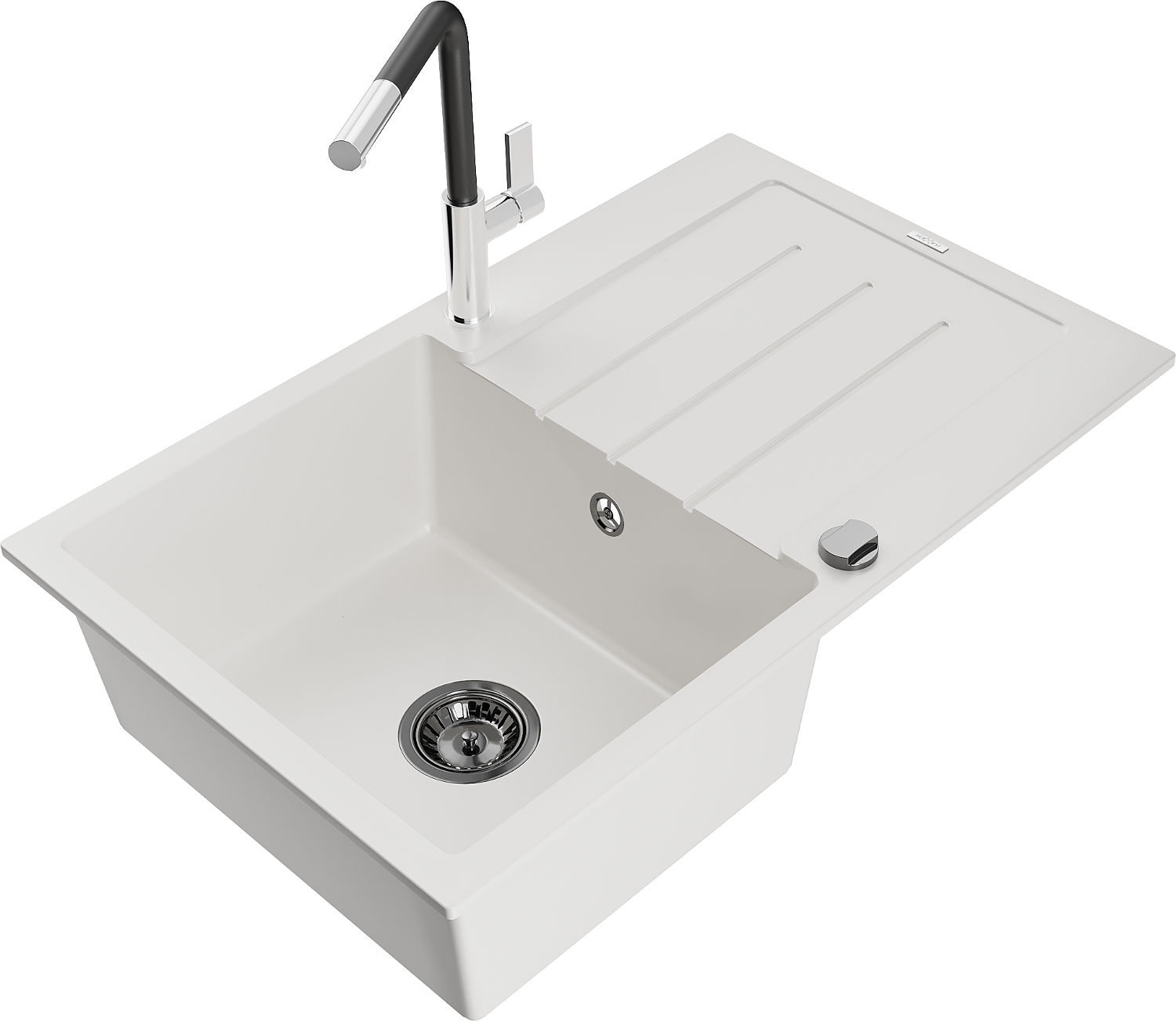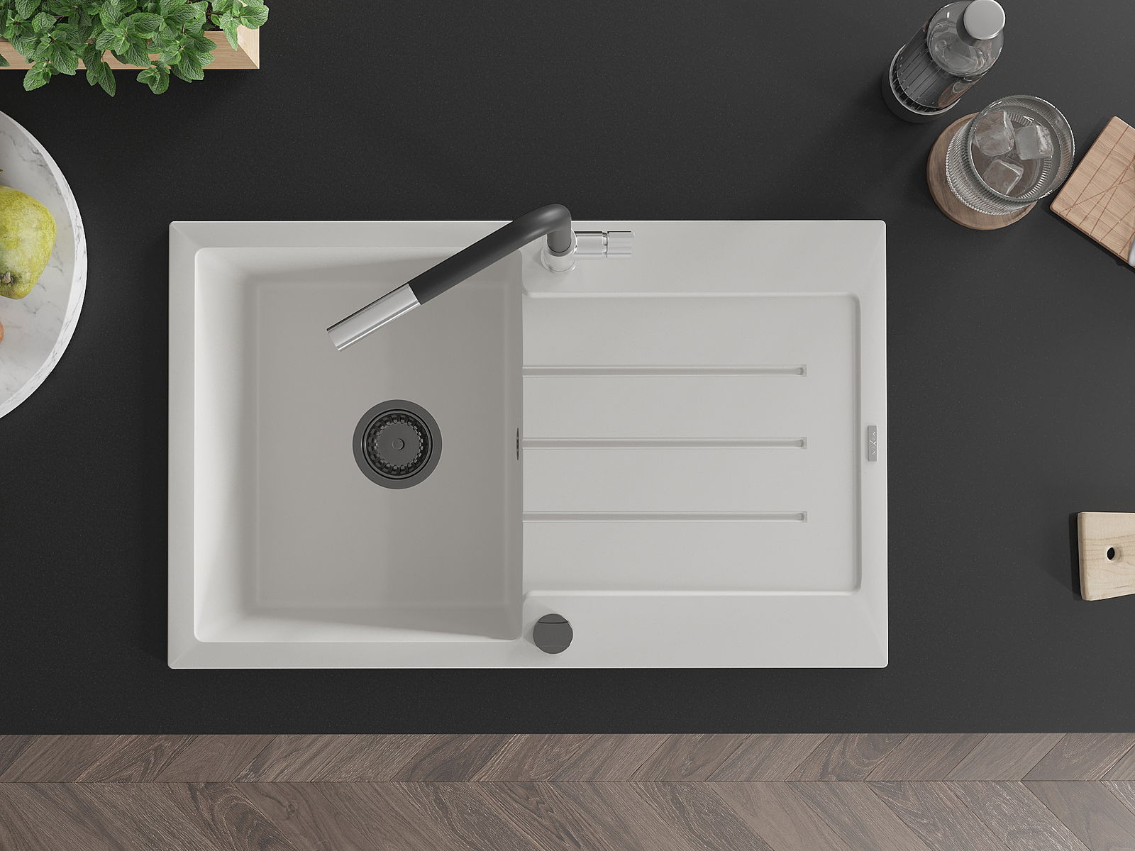Mexen Bruno гранитна кухненска мивка с една камера и отцедник и кухненски смесител Flora, бял - 6513-20-670401-07-B