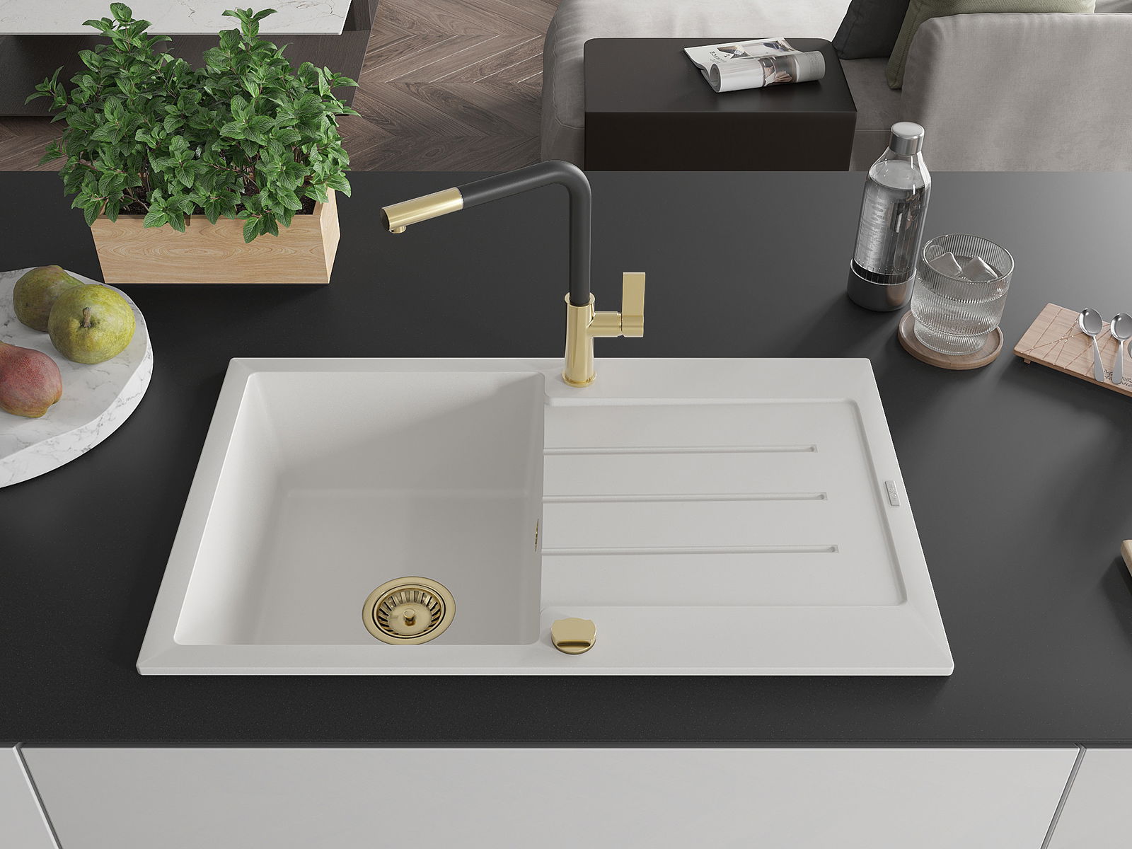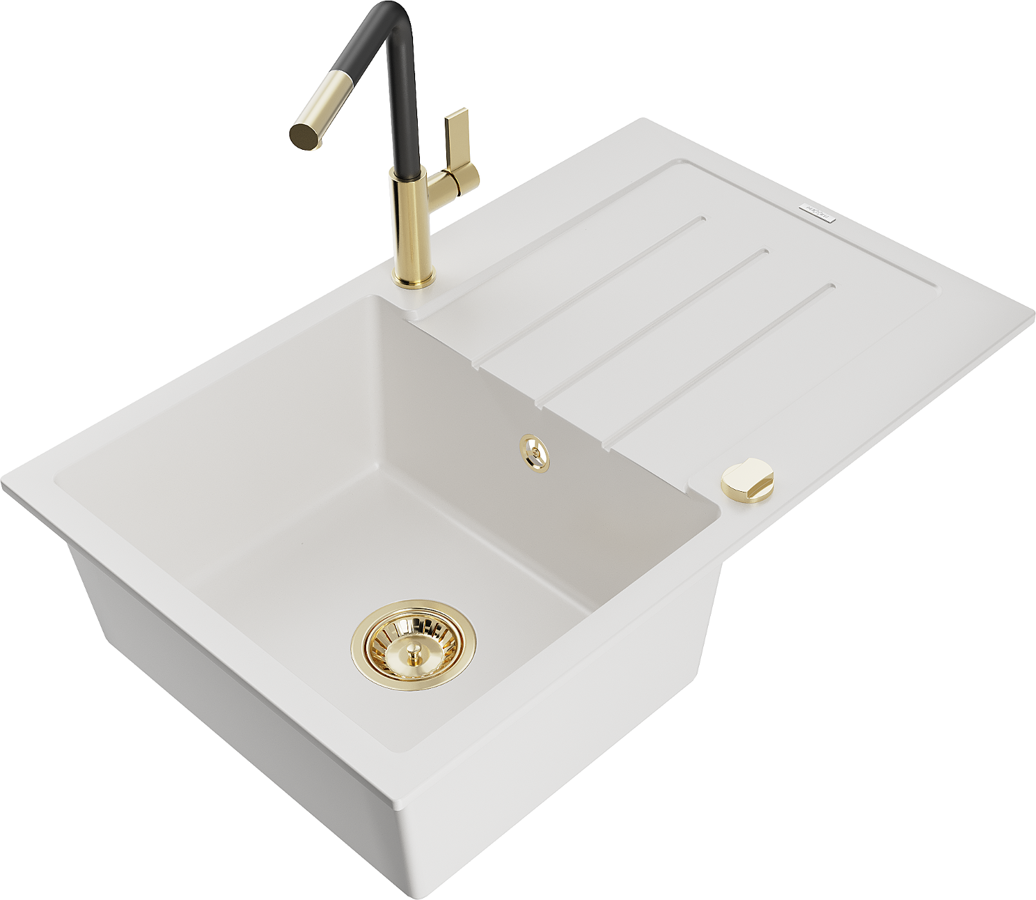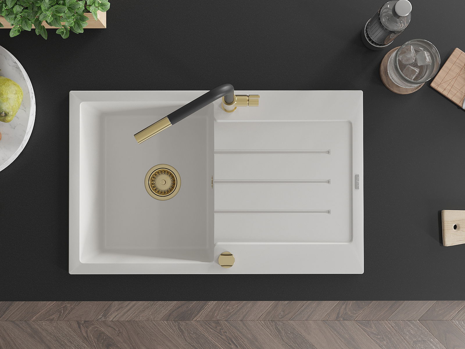 Mexen Bruno кухненска мивка от гранит с 1 отделение, с отцеждаща тава и кухненски смесител Flora, бял - 6513-20-670401-57-G