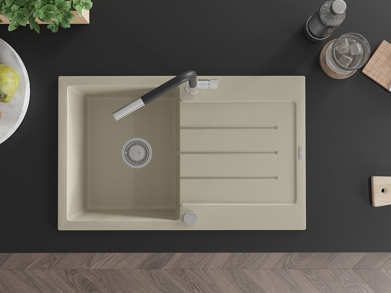 Mexen Bruno гранитна кухненска мивка с 1 отделение и отцедник и кухненски смесител Flora, бежов - 6513-69-670401-07