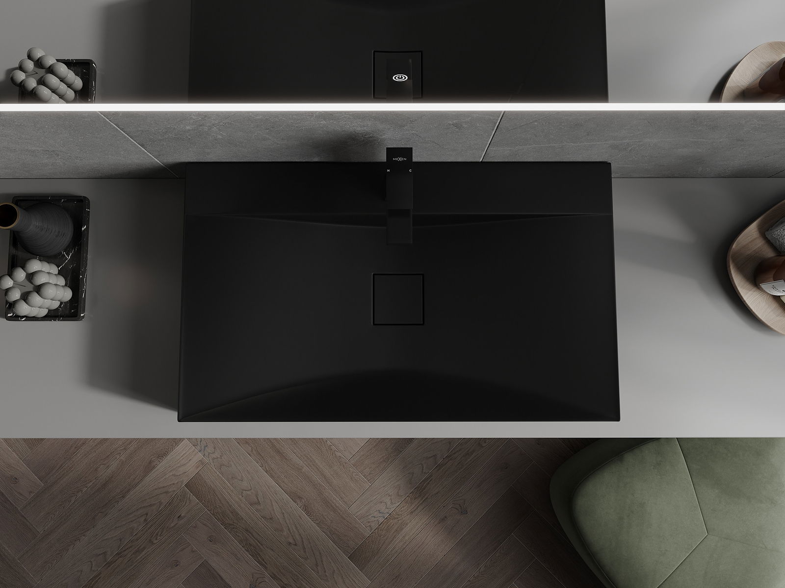 Мивката има дупка, в която можем да монтираме батерията. Това спестява ценно пространство в банята и подчертава естетиката му. Това решение също ви позволява лесно да се държите чисти около мивката.