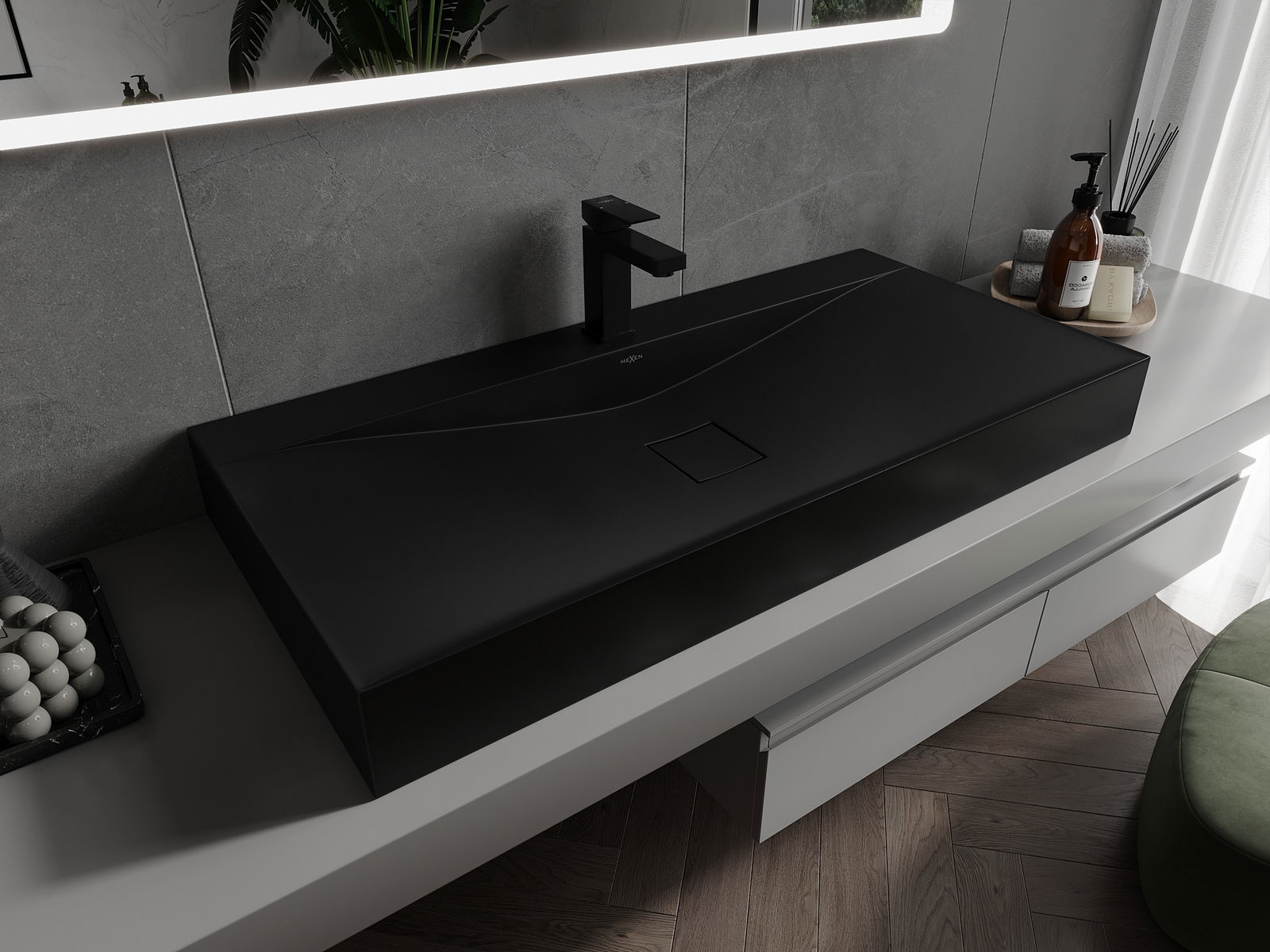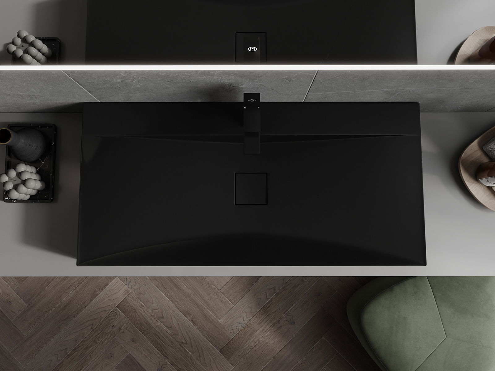Мивката има дупка, в която можем да монтираме батерията. Това спестява ценно пространство в банята и подчертава естетиката му. Това решение също ви позволява лесно да се държите чисти около мивката.