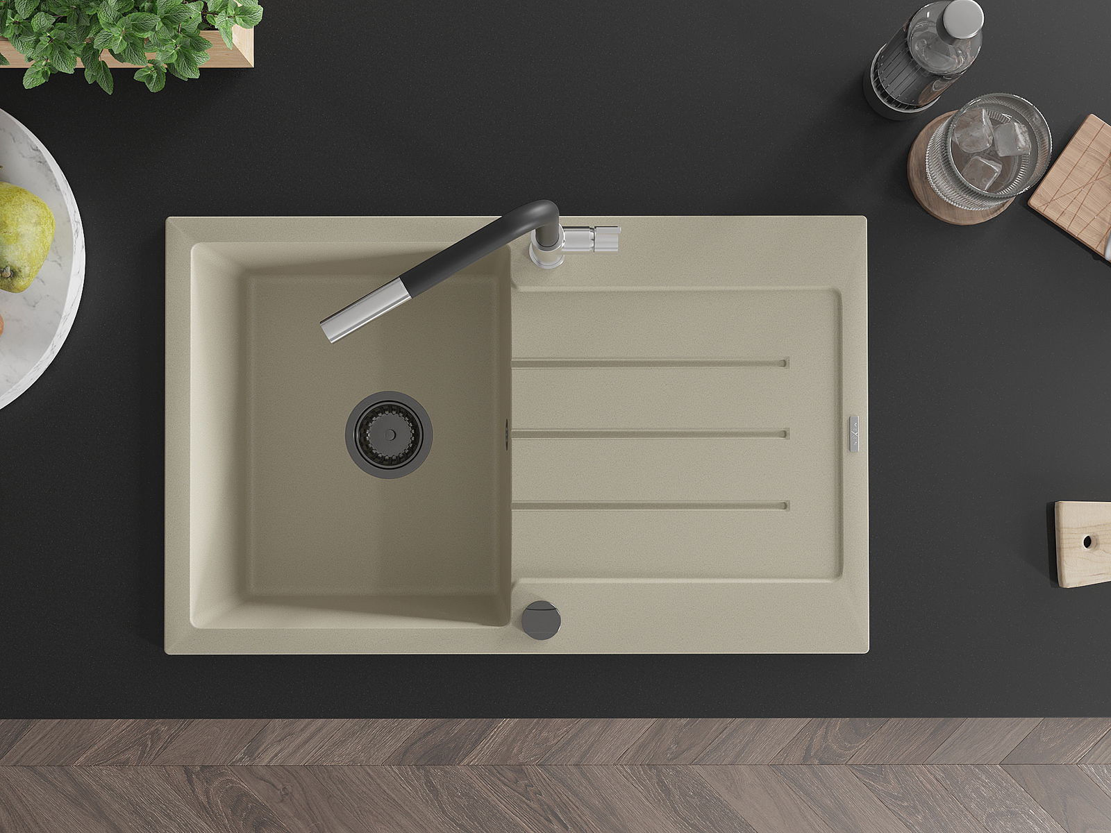 Мивката е направена от висококачествен гранит. Това е елегантно и най -вече практично допълнение към всяка кухня, независимо от нейния стил. Висококачествената и гранитна издръжливост осигуряват много години употреба.