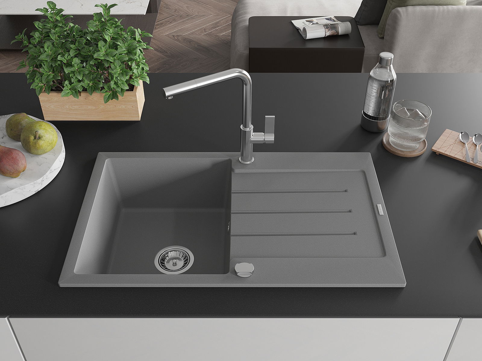 Мивката е направена от висококачествен гранит. Това е елегантно и най -вече практично допълнение към всяка кухня, независимо от нейния стил. Висококачествената и гранитна издръжливост осигуряват много години употреба.