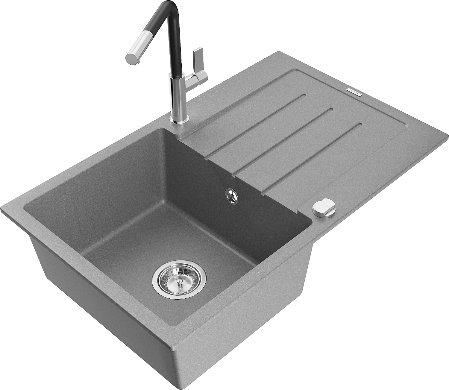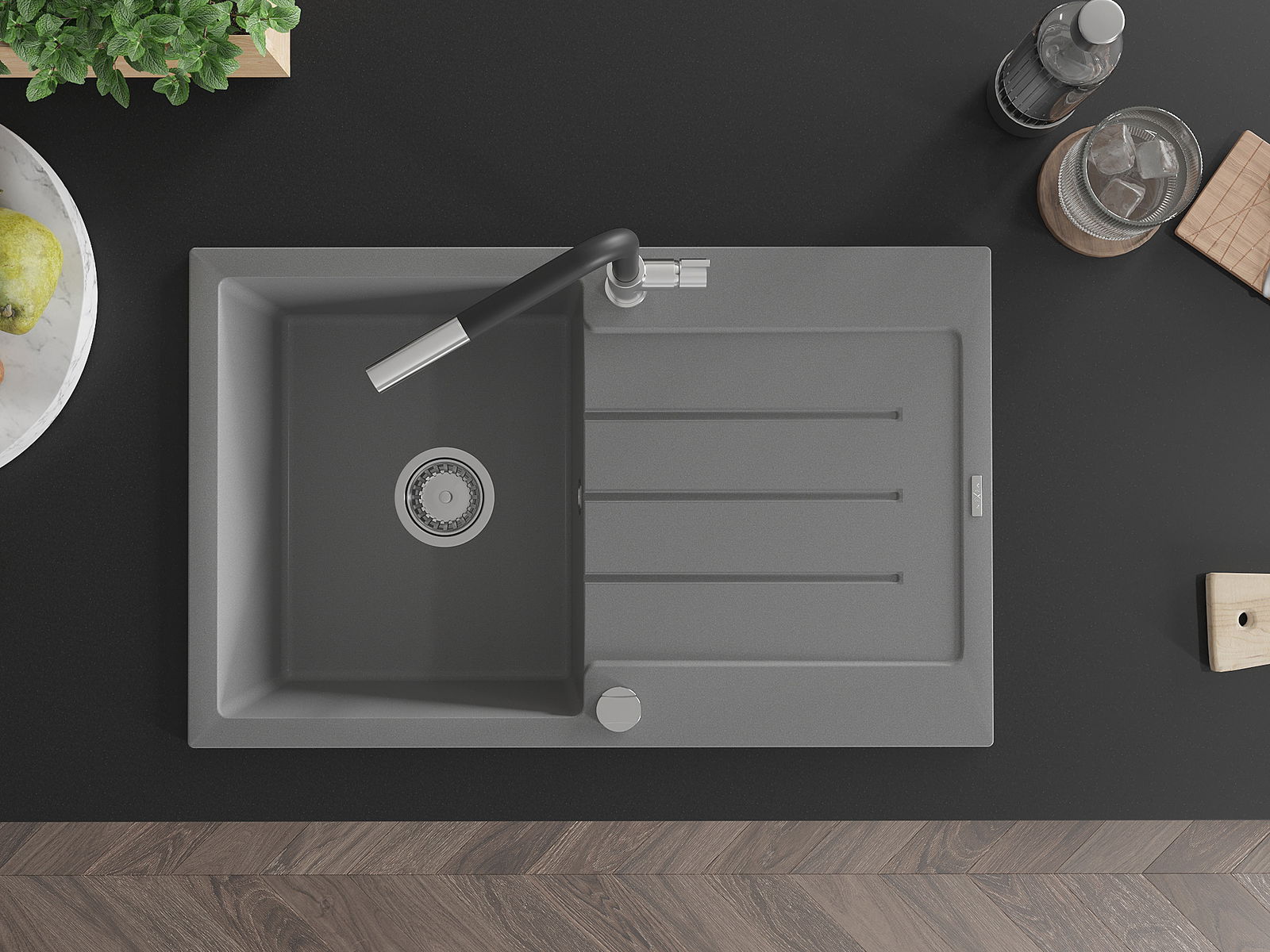 Mexen Bruno мивка от гранит 1-камерна с отцедник и кухненски смесител Flora, сива - 6513-71-670401-07
