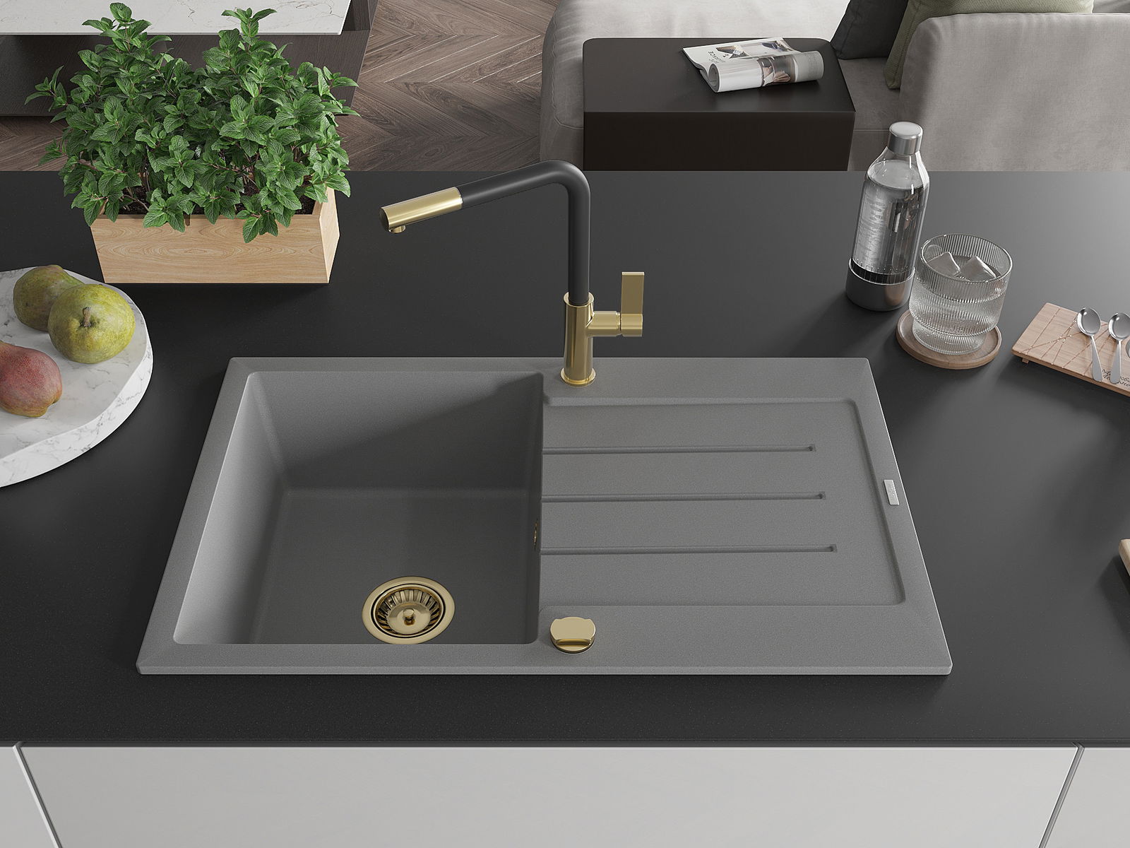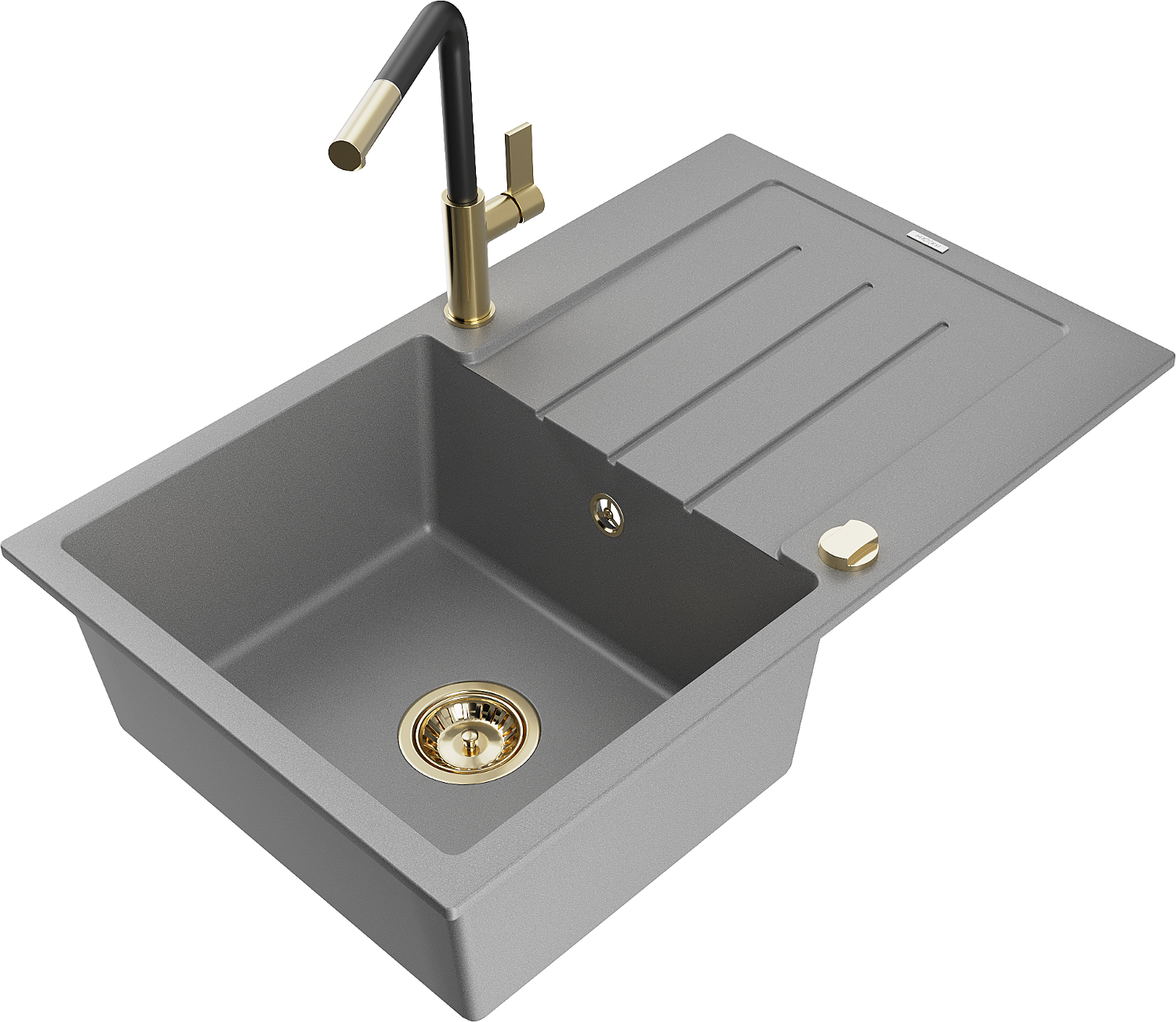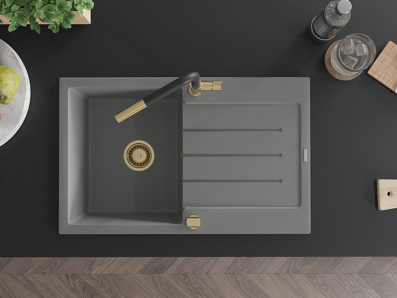 Mexen Bruno гранитна кухненска мивка с 1 корито с отцедник и кухненски смесител Flora, сив - 6513-71-670401-57-G