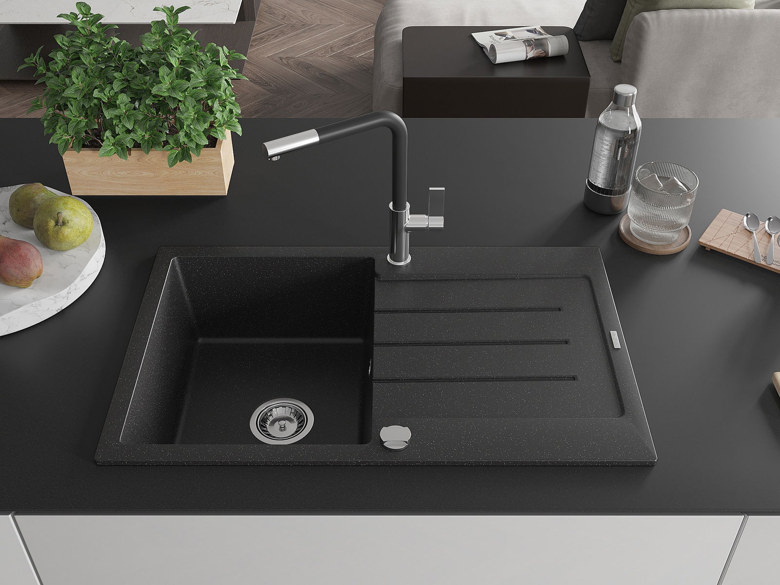 Мивката е направена от висококачествен гранит. Това е елегантно и най -вече практично допълнение към всяка кухня, независимо от нейния стил. Висококачествената и гранитна издръжливост осигуряват много години употреба.