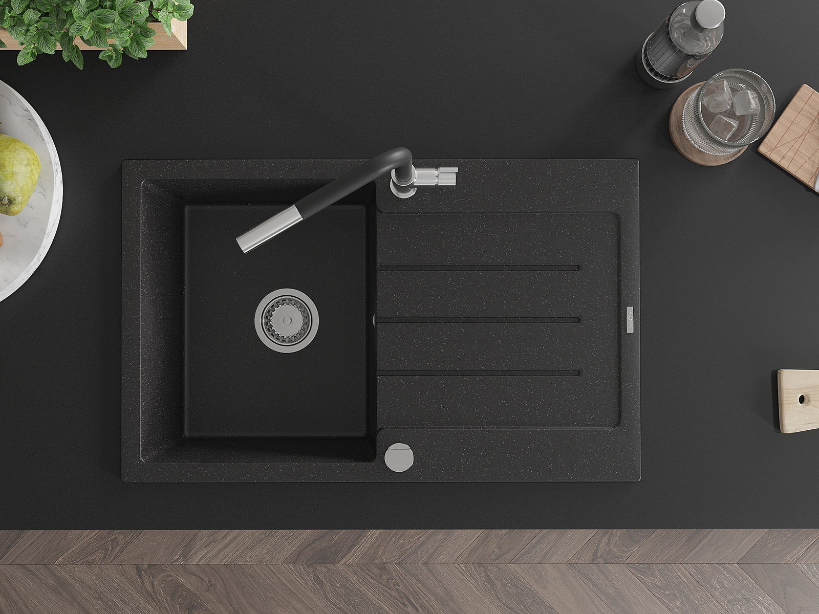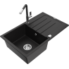 Mexen Bruno гранитна мивка с 1 корито с отцедник и кухненски смесител Flora, черно/сребрист металик - 6513-73-670401-07