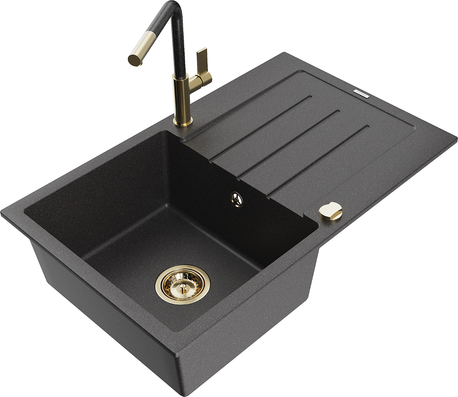 Мивка от гранит Mexen Bruno, 1-коморна с отцедник и кухненски смесител Flora, черен на пръски - 6513-76-670401-75-G