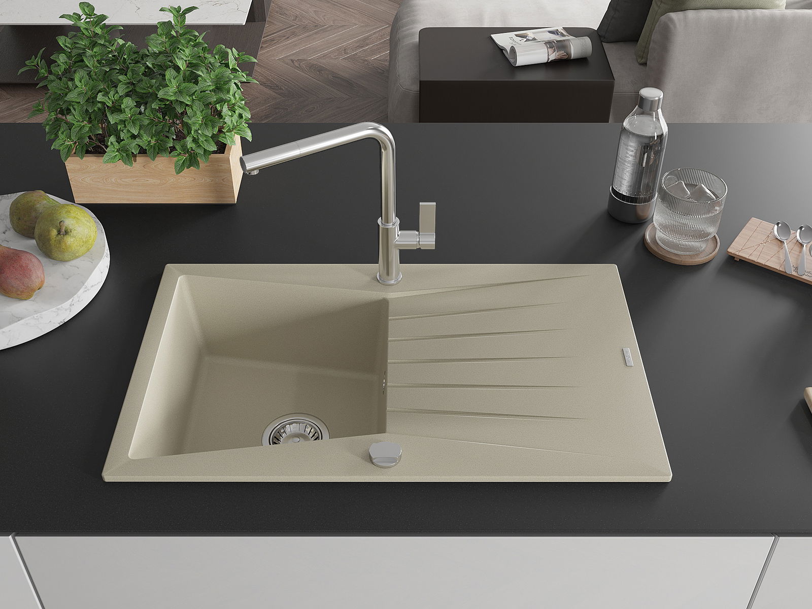 Мивката е направена от висококачествен гранит. Това е елегантно и най -вече практично допълнение към всяка кухня, независимо от нейния стил. Висококачествената и гранитна издръжливост осигуряват много години употреба.