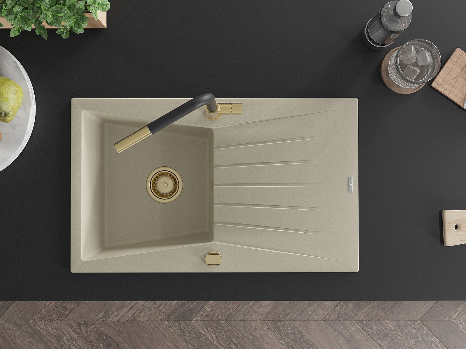 Mexen Cesar гранитна мивка с една камера и отцедник и кухненски смесител Flora, бежов - 6514-69-670401-57-G