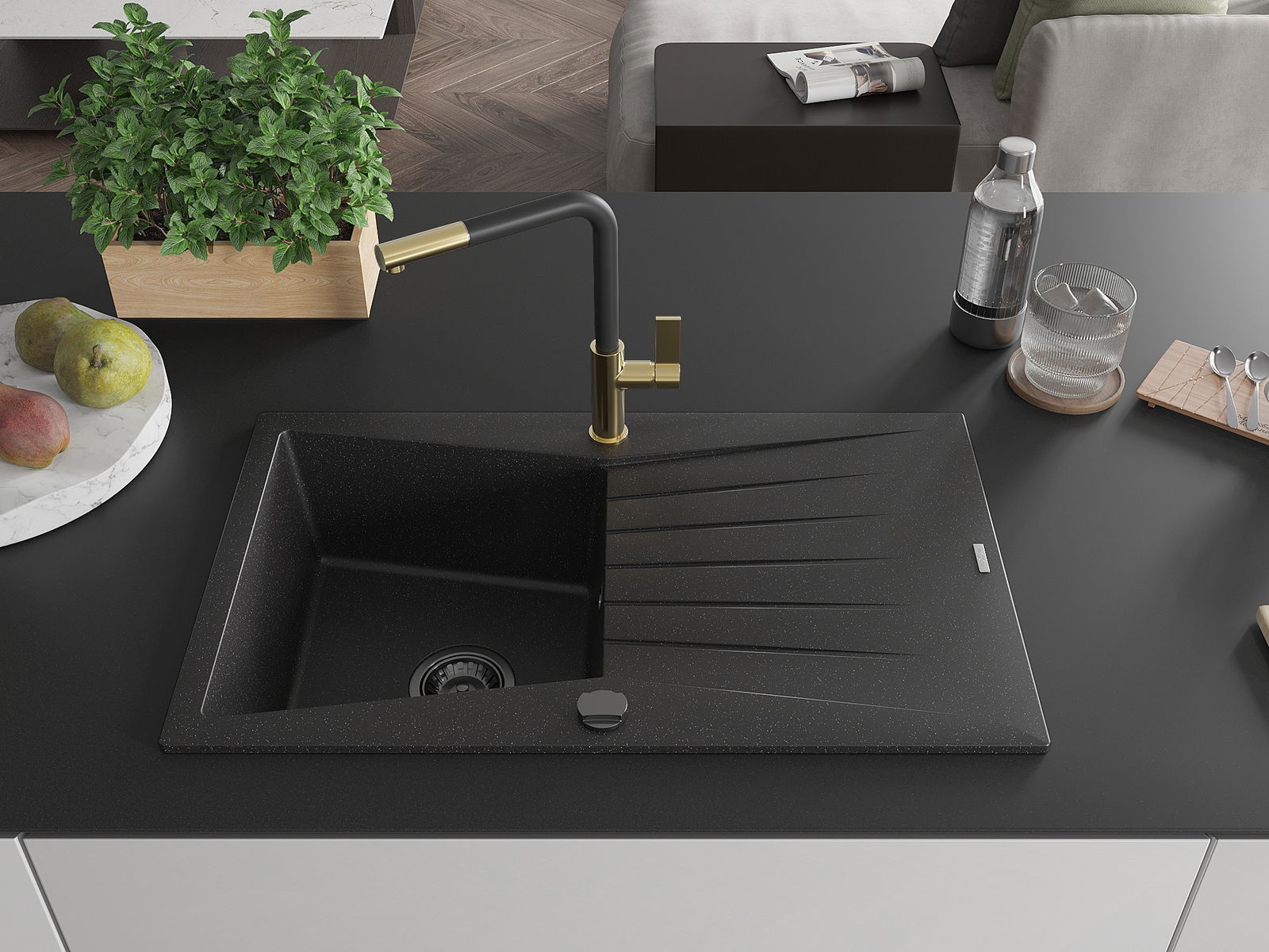 Мивката е направена от висококачествен гранит. Това е елегантно и най -вече практично допълнение към всяка кухня, независимо от нейния стил. Висококачествената и гранитна издръжливост осигуряват много години употреба.