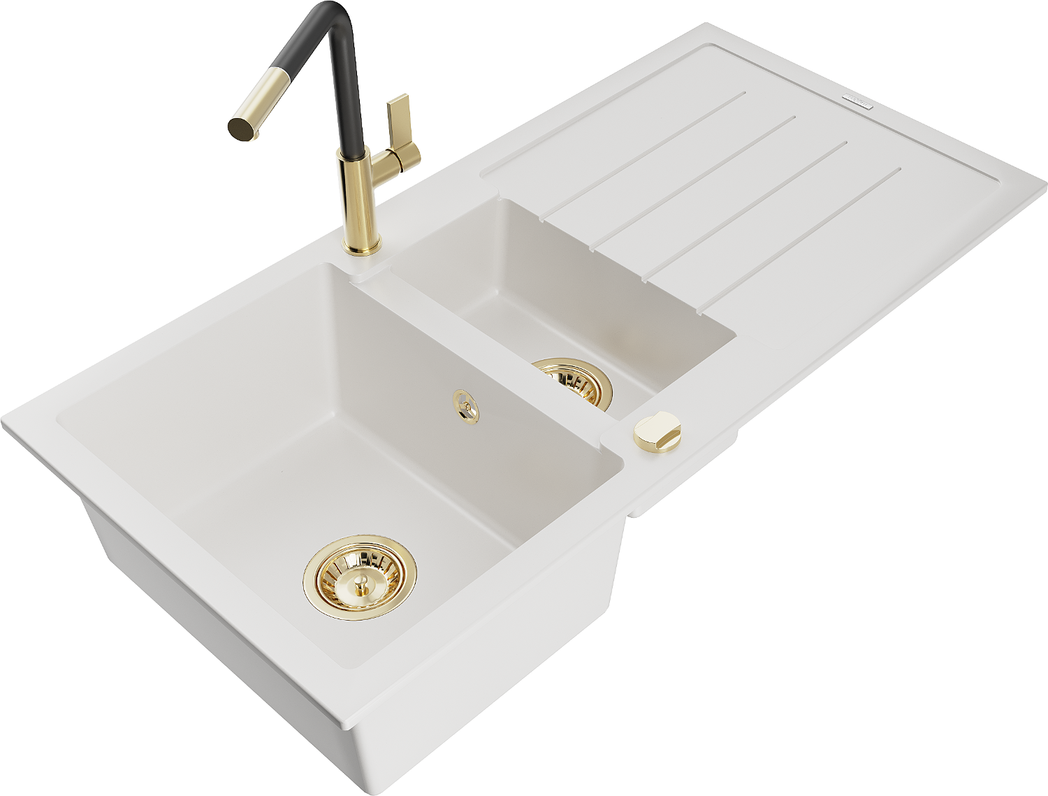 Mexen Andres гранитна мивка 1,5-коморна с отцедник и кухненски смесител Flora, бял - 6515-20-670401-57-G