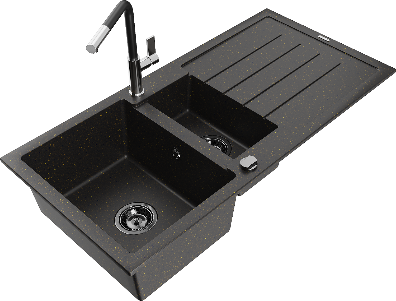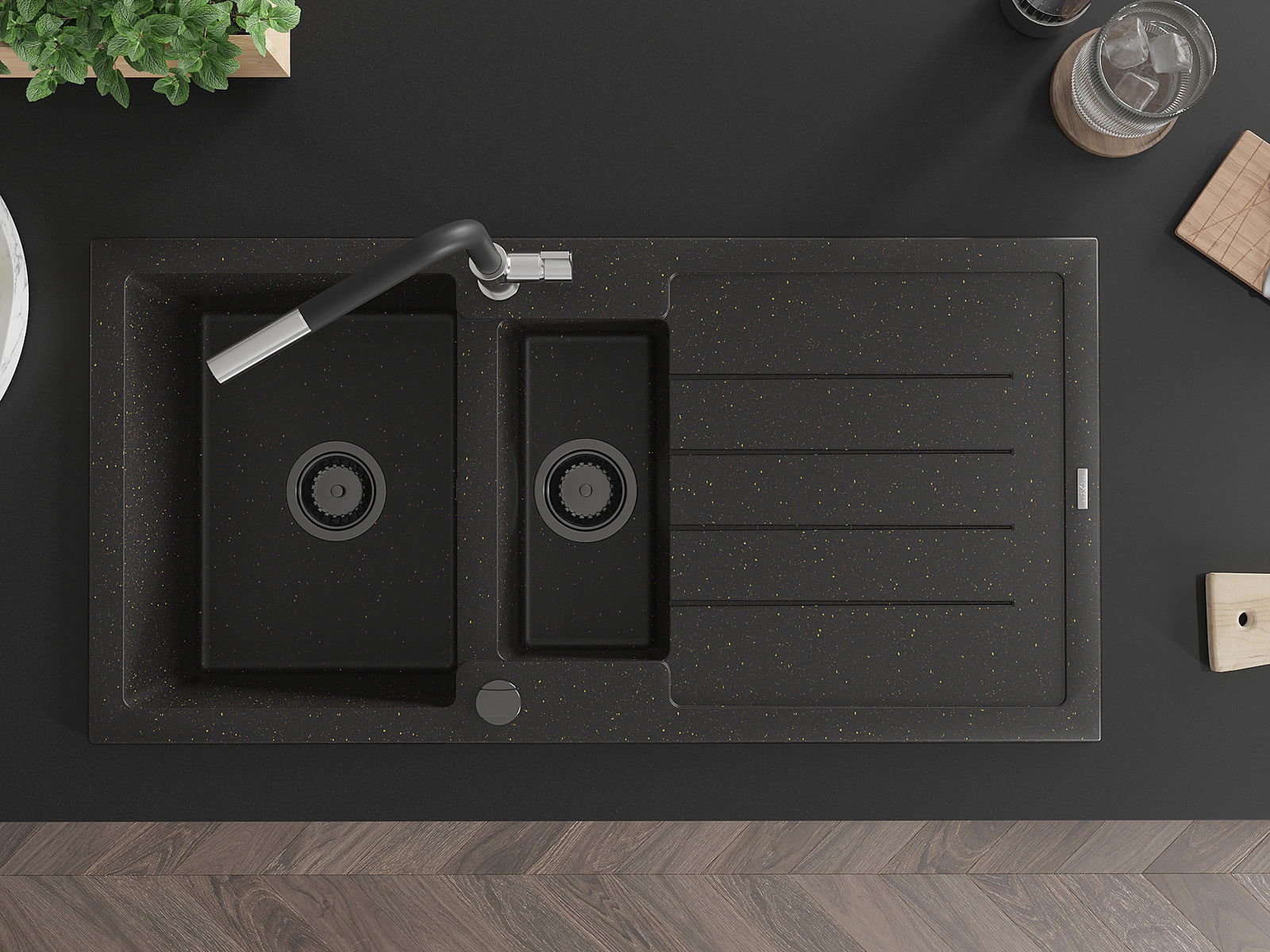 Mexen Andres гранитна мивка 1,5-коморна с отцедник и кухненски смесител Flora, черен/златист - 6515-75-670401-07-B