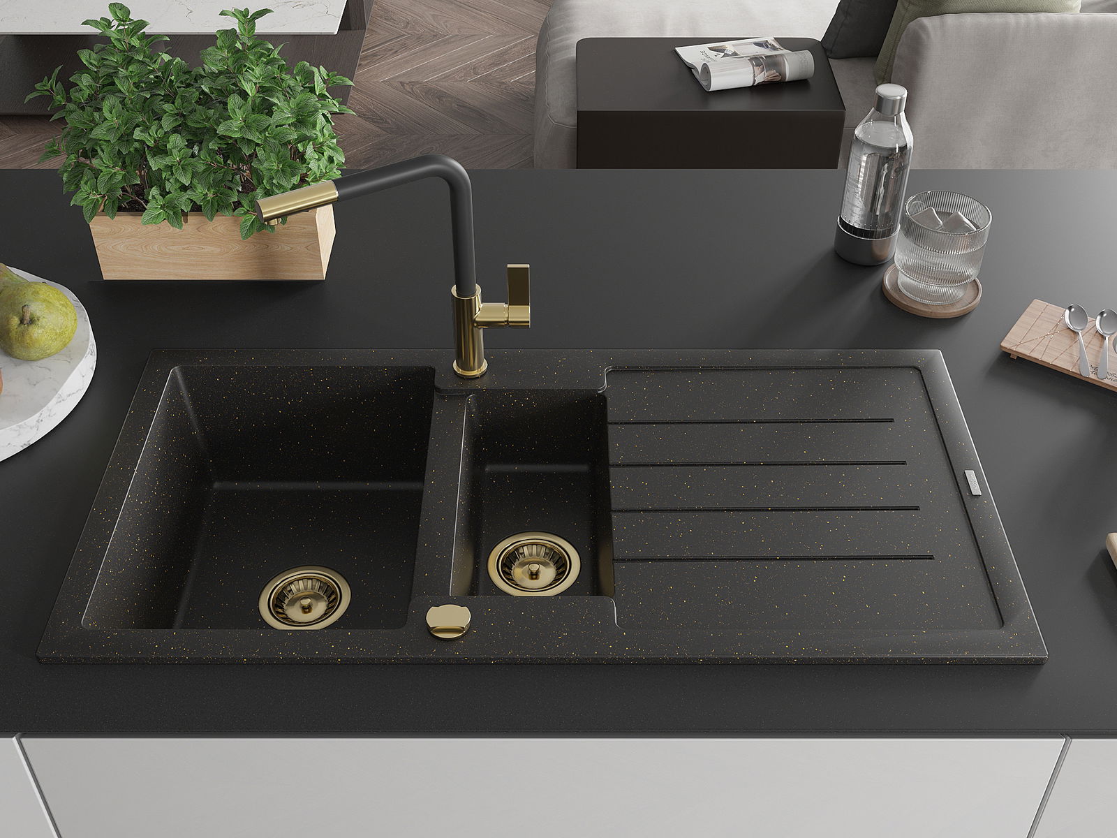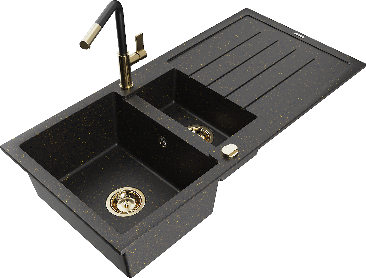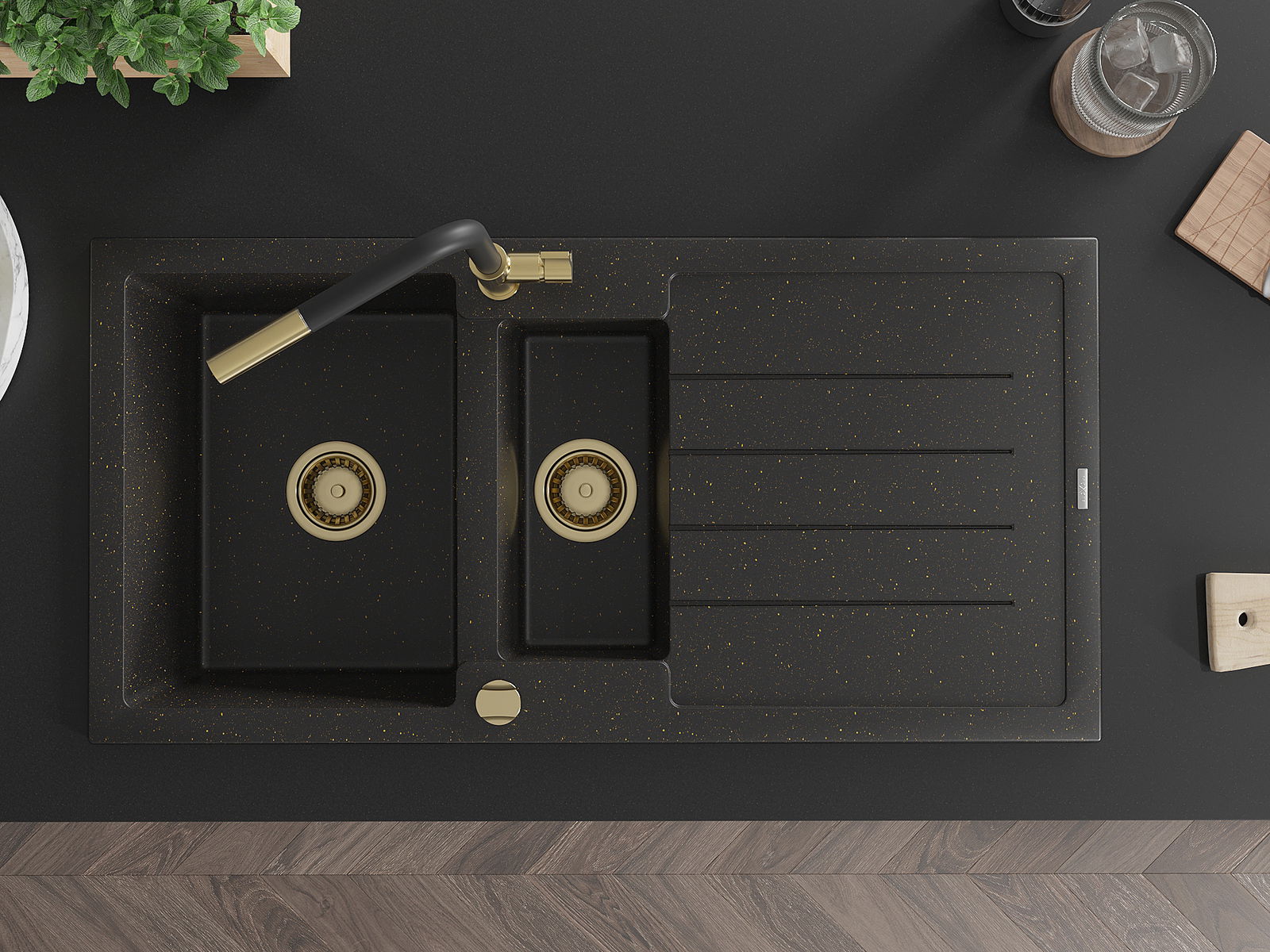 Mexen Andres гранитна мивка с 1,5 камери със сушилник и кухненски смесител Flora, черен/златен - 6515-75-670401-57-G