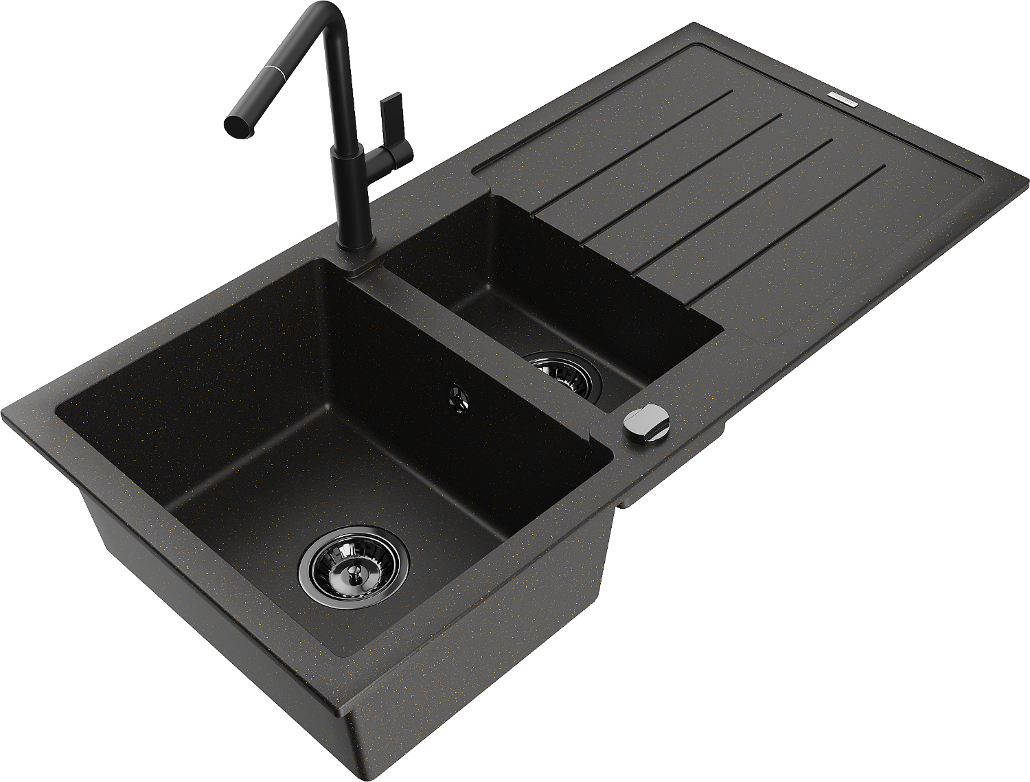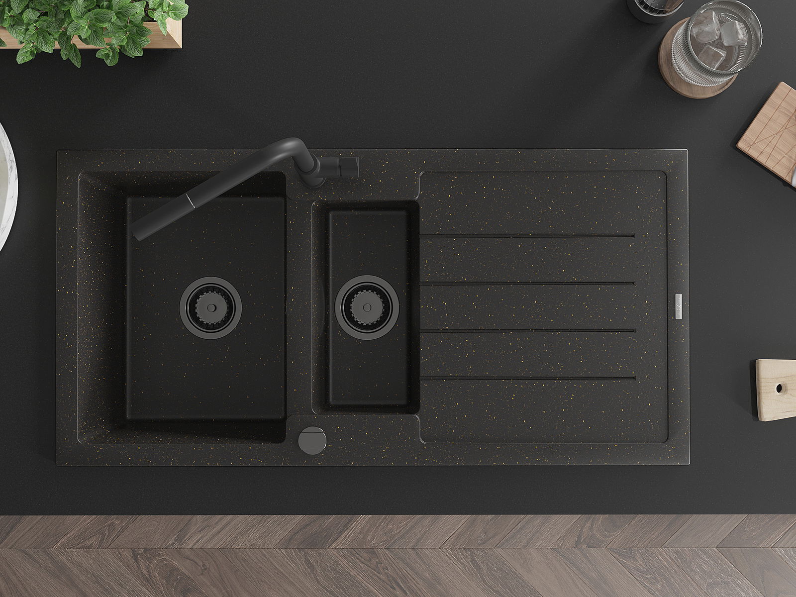 Mexen Andres гранитна мивка с 1,5 камери с отцедник и кухненски смесител Flora, черна/златна - 6515-75-670401-70-B