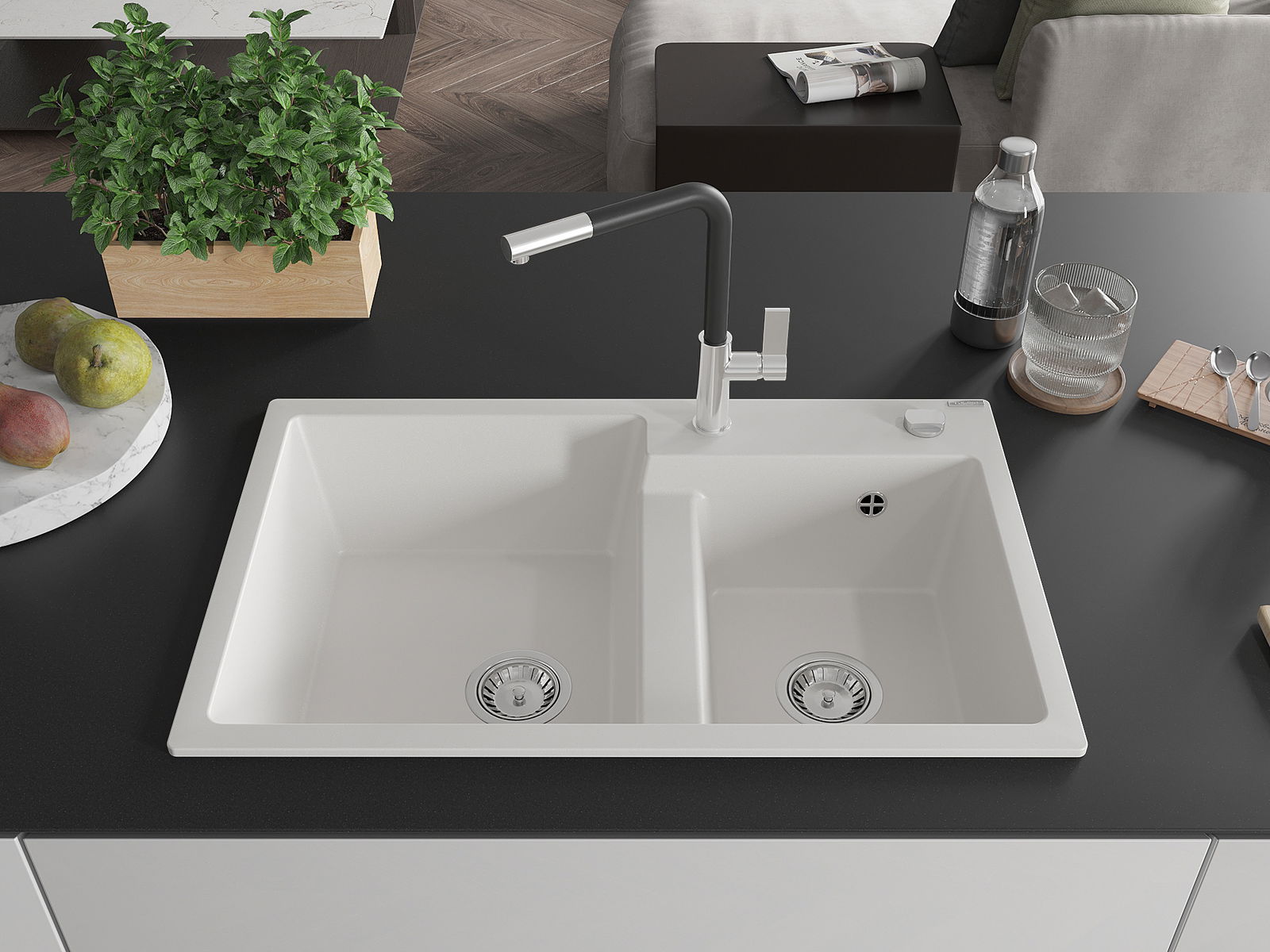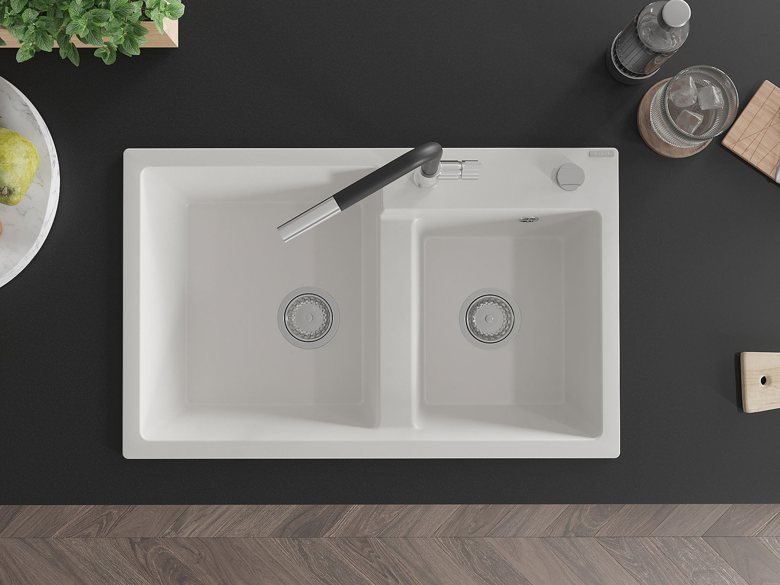 Mexen Tomas гранитна мивка с 2 камери и кухненски смесител Flora, бял - 6516-20-670401-07