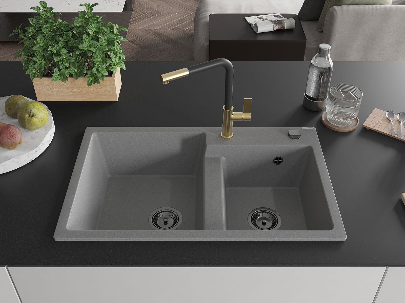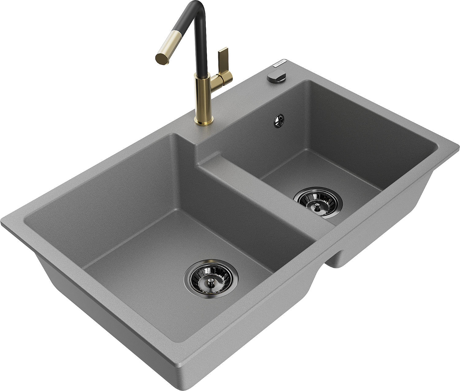 Mexen Tomas гранитна мивка с 2 отделения и кухненски смесител Flora, сив - 6516-71-670401-57-B