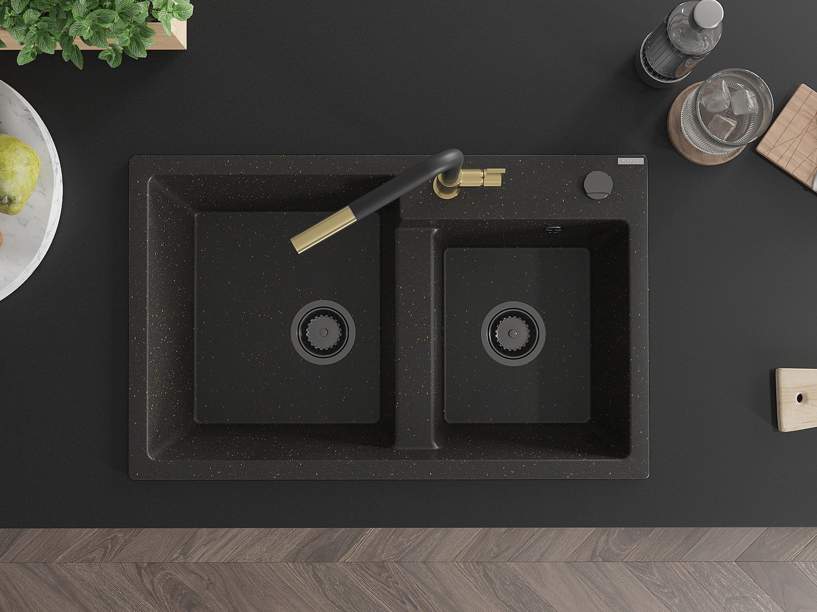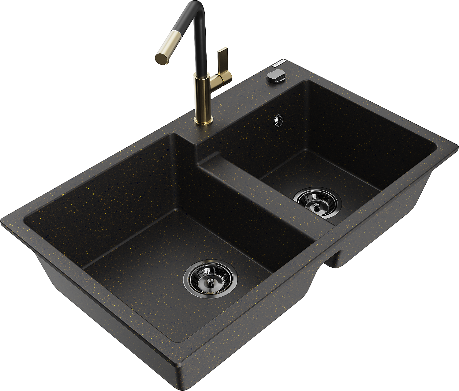 Mexen Tomas гранитна мивка с 2 камери и кухненски смесител Flora, черен/златист металик - 6516-75-670401-57-B