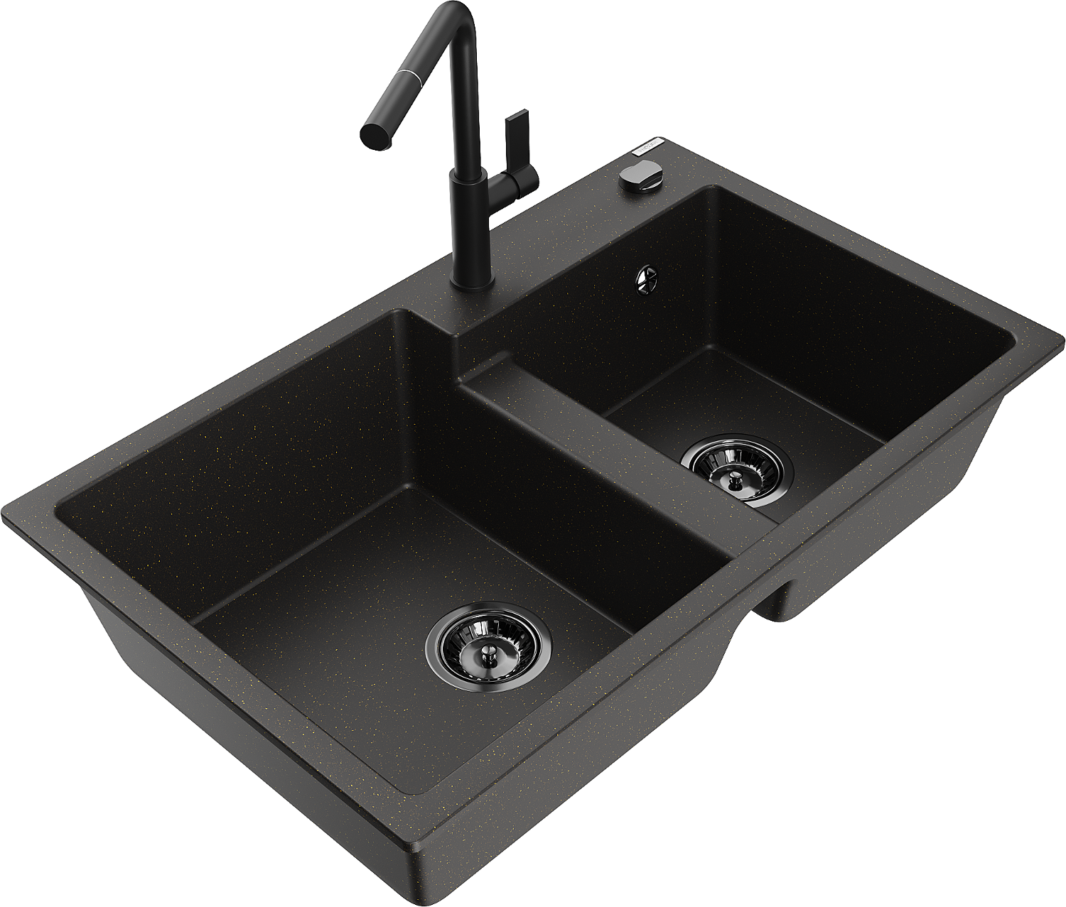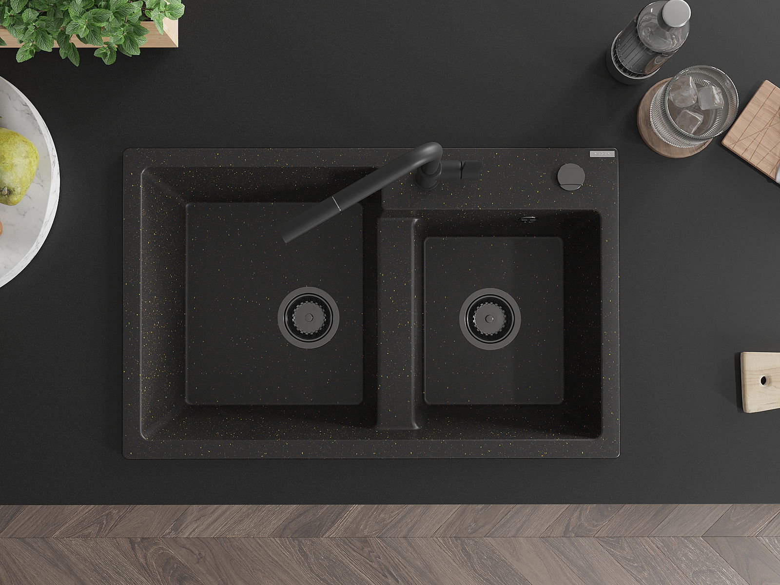 Mexen Tomas гранитна кухненска мивка с 2 камери и кухненски смесител Flora, черен/златен металик - 6516-75-670401-70-B