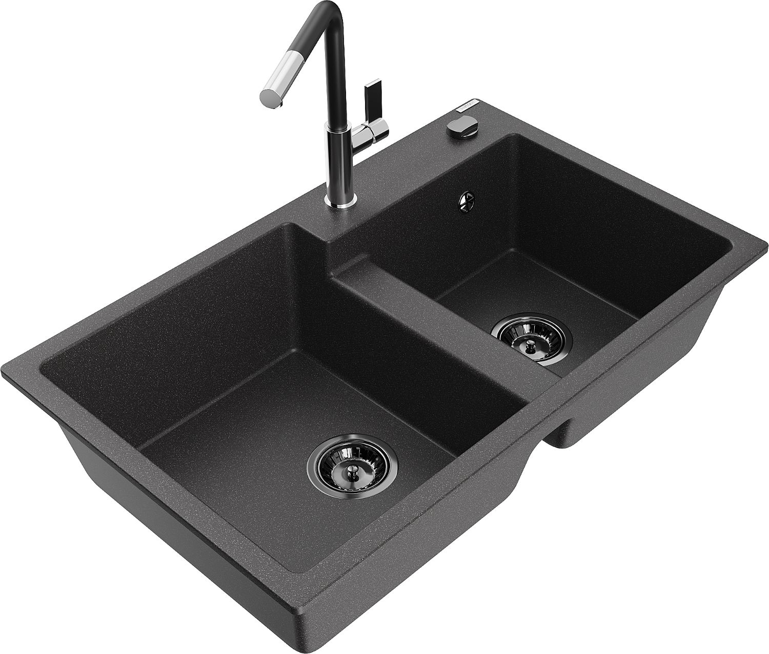 Mexen Tomas кухненска мивка от гранит с 2 камери с кухненски смесител Flora, черен накрапян - 6516-76-670401-07-B