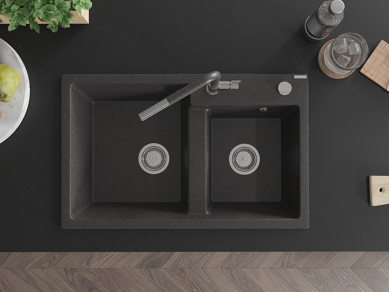 Мивката разполага с предварително издълбан отвор с диаметър 35 мм за самостоятелно изключване. Може да се използва, наред с други неща, за монтаж на дозатор за течност, който ще елиминира наличието на пластмасови бутилки в кухнята и ще й придаде елегантно завършване.