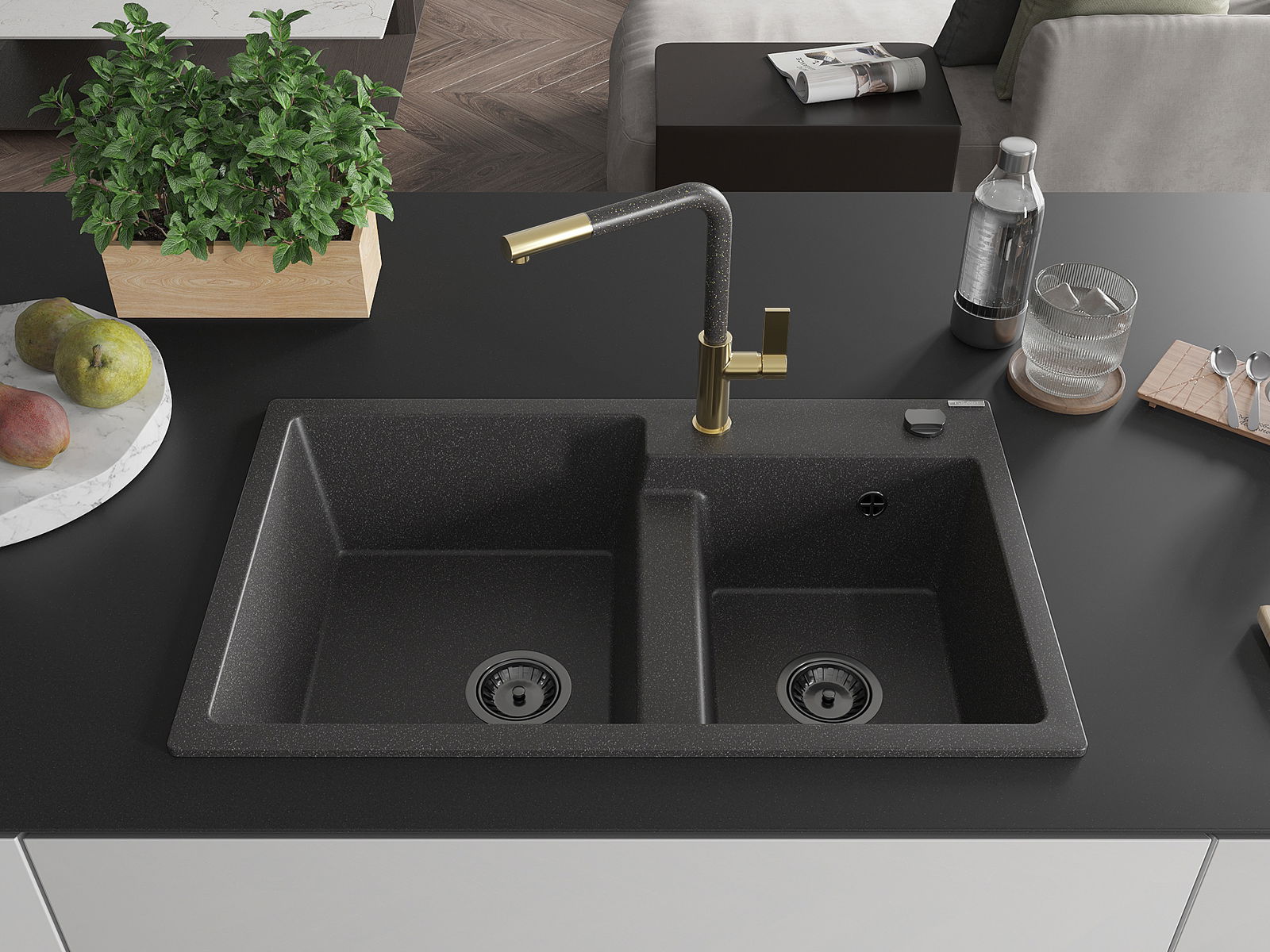 Mexen Tomas гранитна мивка 2-камерна с кухненски смесител Flora, черен на петна - 6516-76-670401-75-B